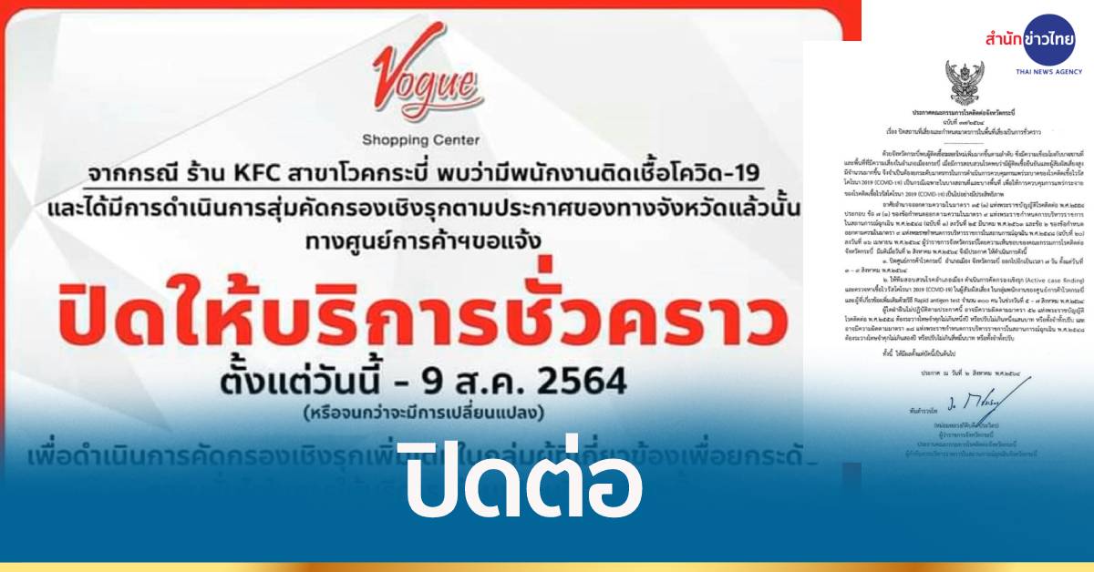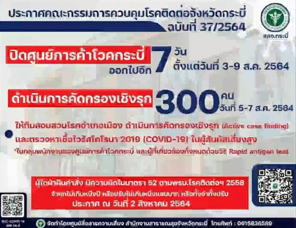 คณะกรรมการโรคติดต่อจังหวัดกระบี่ ได้ออกประกาศขยายเวลา ปิดศูนย์การค้าโวคกระบี่ ออกไปอีก 7 วัน ตั้งแต่วันนี้ไปจนถึงวันที่ 9 สิงหาคม 2564 เพื่อให้ทีมสอบสวนโรคได้คัดเกรองกลุ่มเสี่ยง เพื่อตรวจหาเชื้อ ยับยั้งการแพร่ระบาดในวงกว้าง.- สำนักข่าวไทย