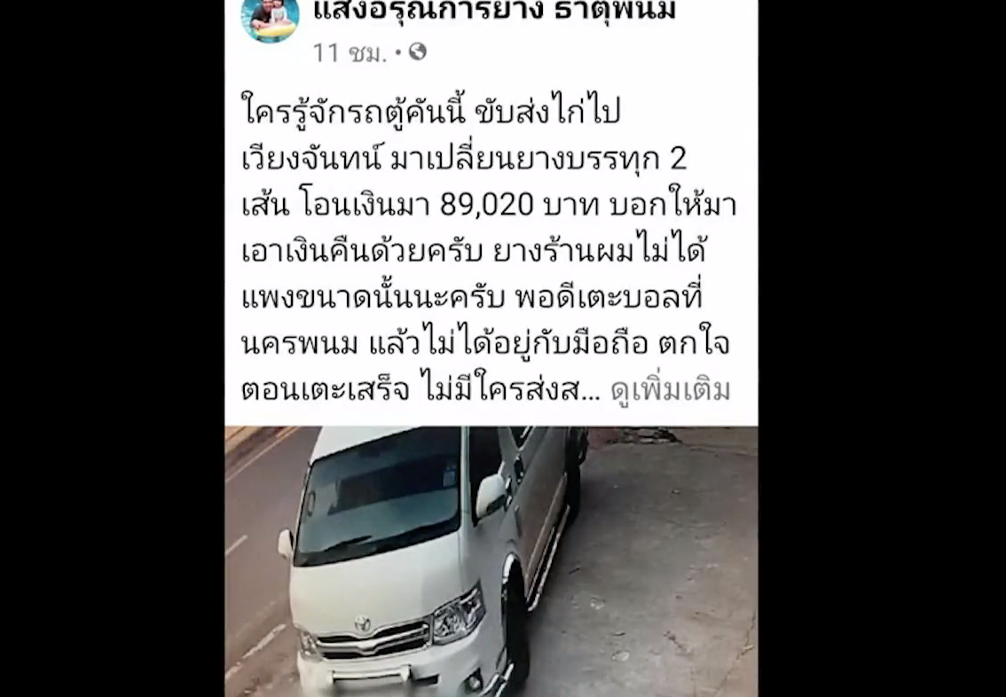 สืบเนื่องจากมีผู้ใช้เฟซบุ๊กชื่อ “แสงอรุณการยางธาตุพนม” โพสต์ข้อความ “ใครรู้จักรถตู้คันนี้ ขับส่งไก่ไปเวียงจันทน์ มาเปลี่ยนยางบรรทุก 2 เส้น โอนเงินมา 89,020 บาท บอกให้มาเอาเงินคืนด้วยครับ ยางร้านผมไม่ได้แพงขนาดนั้นนะครับ พอดีเตะบอลที่นครพนม แล้วไม่ได้อยู่กับมือถือ ตกใจตอนเตะเสร็จ ไม่มีใครส่งสลิปมา ต้องโอนผิดแน่นอน #ซื่อกินไม่หมด_คดกินไม่นาน”