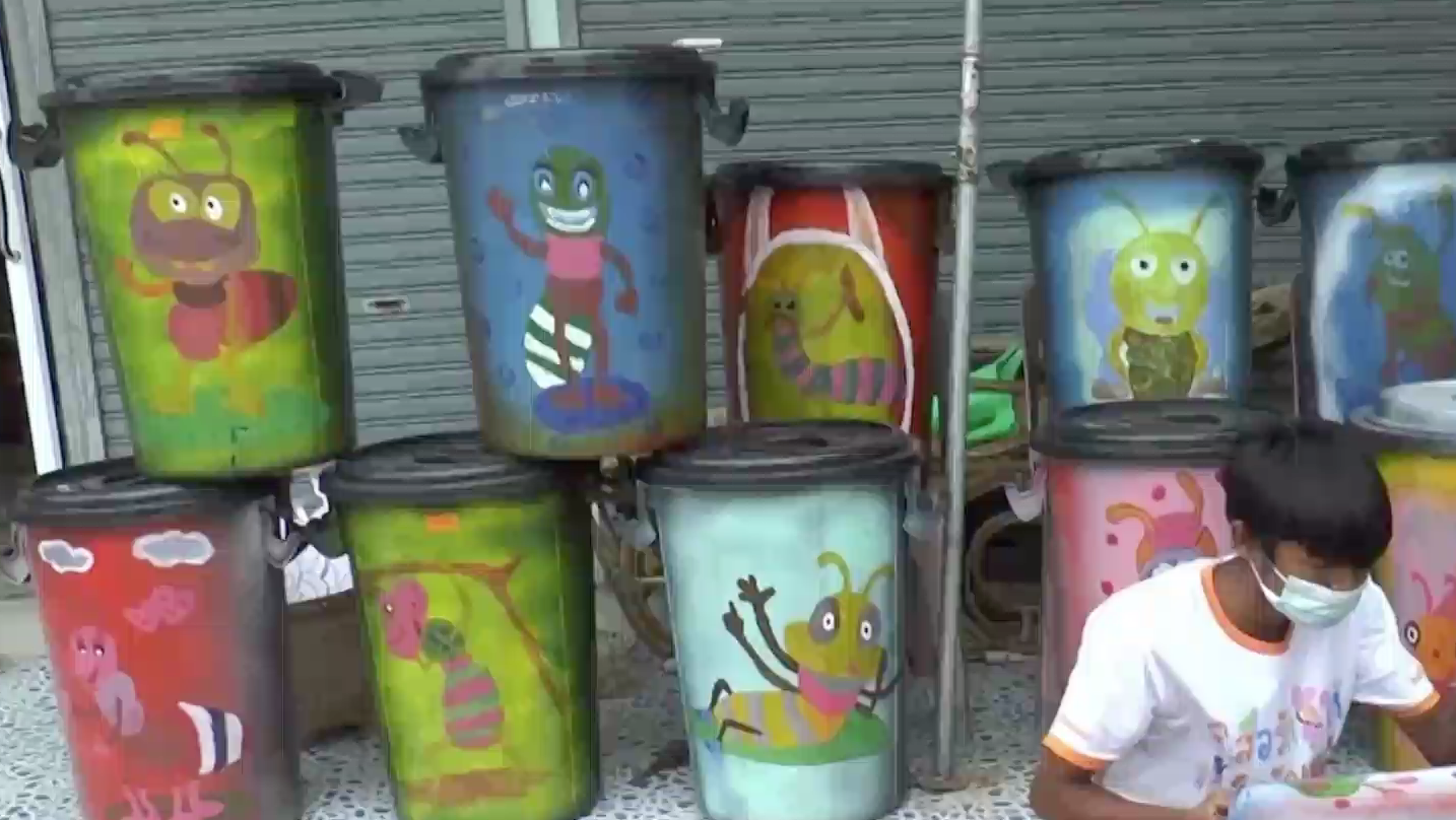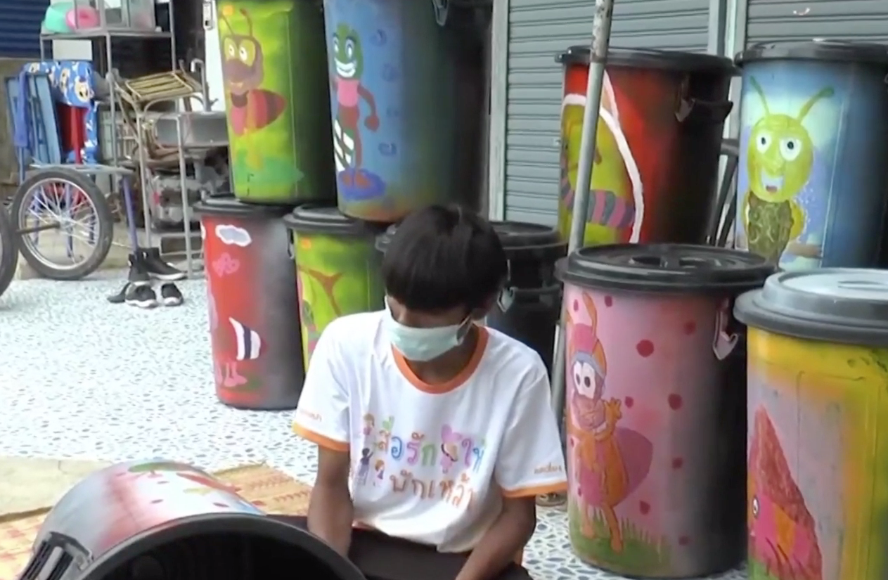 น้องโก้ บอกว่าเป็นคนที่ชื่นชอบวาดรูปมาตั้งแต่เด็กๆ เพราะได้มีโอกาสเรียนวาดรูปมาบ้าง จึงทำให้มีความรู้และทักษะในการวาดรูป อีกทั้งอยากช่วยเหลือสังคม จึงนำถังพลาสติกสีดำ จำนวน 20 ถัง มาเพ้นท์สีและวาดรูปตัวการ์ตูนในรูปแบบต่างๆ ลงบนถังขยะ เพื่อให้มีลวดลายสีสัน สวยงาม