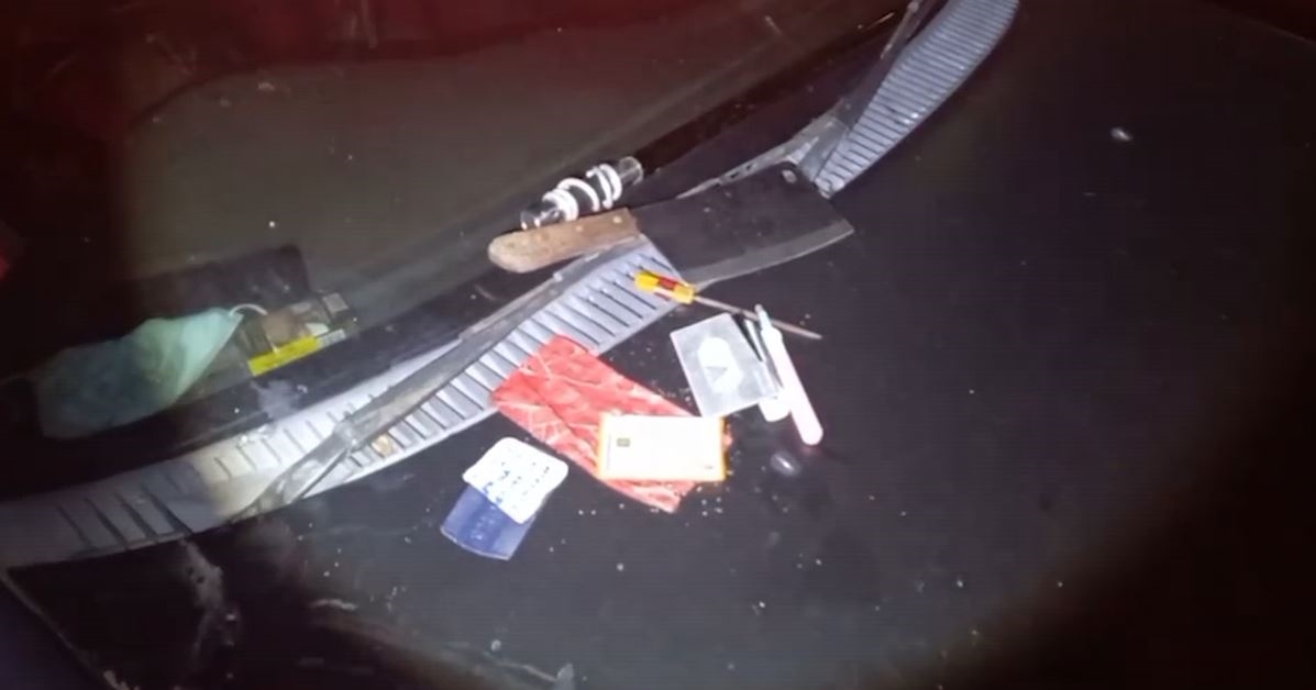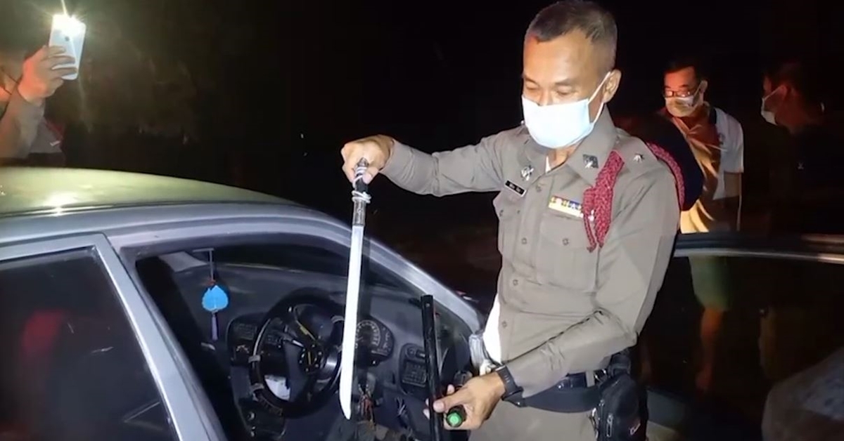 ทราบชื่อคนร้าย คือ นายมนัส จุ้ยเกิด อายุ 38 ปี จากการตรวจสอบภายในรถ พบมีดซามูไร ยาวประมาณ 1 เมตร 1 เล่ม มีดทำครัว 1 เล่ม รวมถึงอุปกรณ์การเสพยาเสพติด