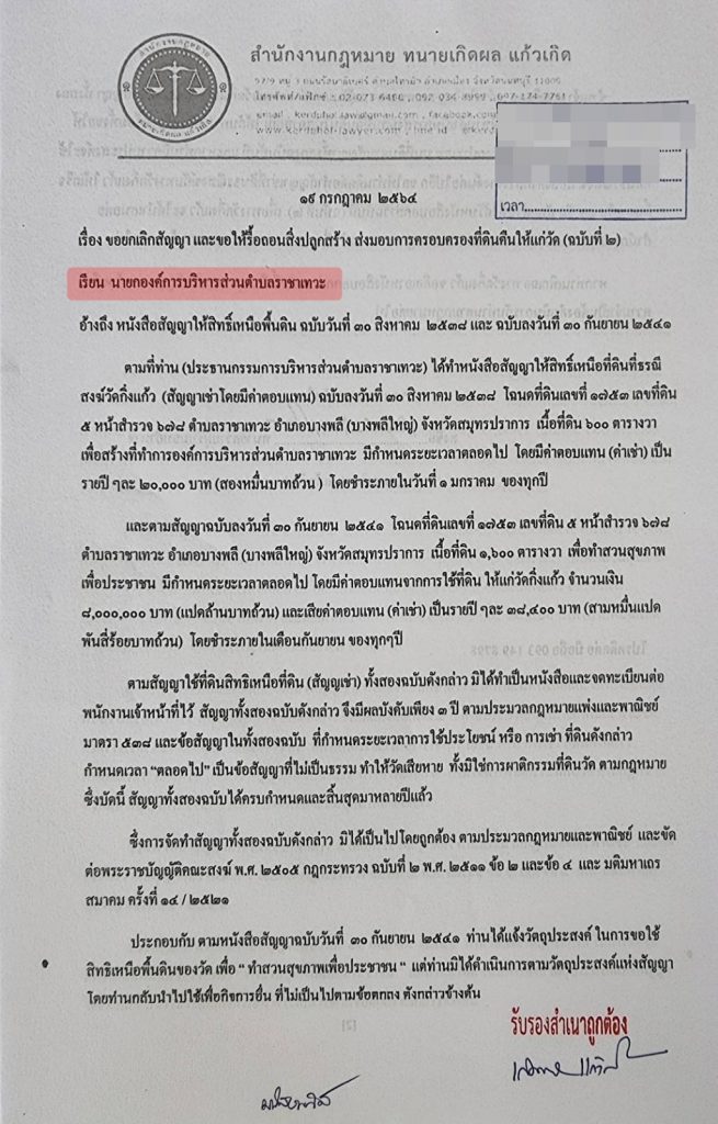 นายเกิดผล กล่าวอีกว่า วัดกิ่งแก้วจึงได้มอบอำนาจให้ตนเป็นทนายความ ทำหนังสือบอกเลิกสัญญาเช่าที่ดินกับ อบต.ราชาเทวะ ซึ่งตนได้ทำหนังสือแจ้งเรื่องดังกล่าวกับ อบต.ราชาเทวะ ไปแล้วครั้งหนึ่ง แต่ อบต.ราชาเทวะ เพิกเฉย ตนจึงทำหนังสือแจ้งเป็นครั้งที่ 2 เมื่อวันที่ 19 ก.ค.ที่ผ่านมา ขอยกเลิกสัญญาเช่าที่ดินทั้งสองฉบับ และขอให้ อบต.ดำเนินการส่งมอบที่ดินคืนในสภาพเดิมให้กับวัดกิ่งแก้ว รวมทั้งขอให้ระงับการก่อสร้างอาคารบนที่ดินดังกล่าวทันที หาก อบต.มีความประสงค์จะใช้ที่ดินธรณีสงฆ์แปลงดังกล่าวต่อไปอีก ขอให้ติดต่อทำสัญญาเช่าที่ดินกับวัดกิ่งแก้วให้เสร็จสิ้นภายใน 15 วัน เพื่อที่ทางวัดจะได้รายงานผลให้สำนักงานพระพุทธศาสนาทราบต่อไป
