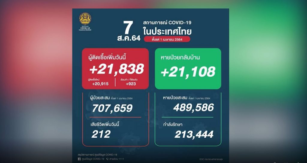 โควิดในไทย วิกฤติหนัก วันนี้ยอดติดเชื้อนอกจากจะทะลุ 21,000 คน เป็นวันที่ 2 ตัวเลขผู้เสียชีวิตยังพุ่งไปถึง 212 คน ซึ่งมากกว่าเมื่อวานที่เสียชีวิต 191 คน ทำให้ตอนนี้ไทยพบผู้ติดเชื้อระลอกเมษายนไปแล้ว 707,659 คน กำลังรักษาตัว 213,444 คน