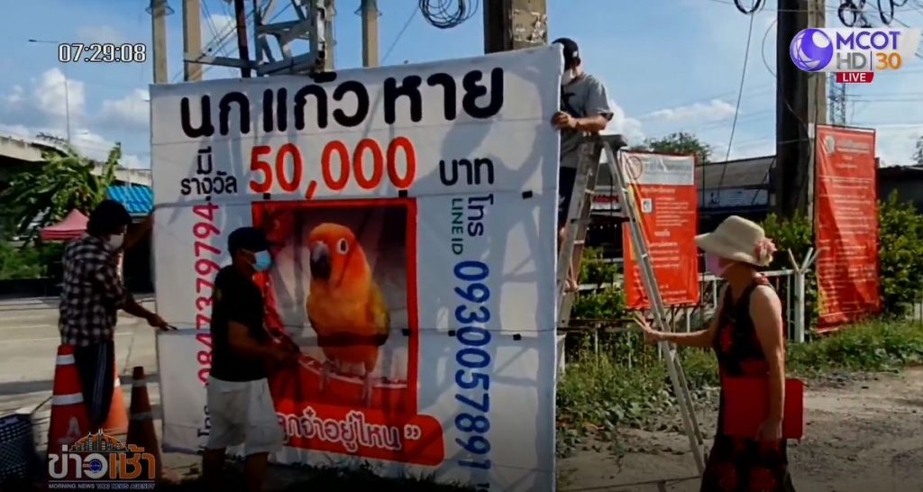 น.ส.สุชาดา ศิริวิบูลย์ชัย อายุ 64 ปี ว่าจ้างคนนำป้ายขนาดใหญ่มาติดริมถนซ่อมสร้าง ต.บ้านใหม่ อ.เมือง จ.ปทุมธานี โดยมีข้อความว่า “นกแก้วหาย มีรางวัล 50,000 บาท เบอร์โทรและไอดีไลน์ 0847379794 และ 0930057891 พร้อมรูปถ่ายนกแก้วสีเหลือง “ลูกจ๋าอยู่ไหน” น้องโชค ตัวเล็กๆ หายออกจากหมู่บ้านกฤษณา-ติวานนท์ ซอยพระแม่การุณย์ 27 ใกล้สวนสมเด็จ ทางออกศรีสมาน นนทบุรี ตั้งแต่วันที่ 30 มิถุนายน 2564 ขอบคุณมากนะคะ” โดยมี “เครื่องหมายตำหนิคือมีโซ่สั้นๆ ติดอยู่กับห่วงที่ขาข้างขวา ไม่มีเบอร์โทรศัพท์ติดขา ขนที่หางมีแซมสีน้ำเงินนิดๆ คะ”