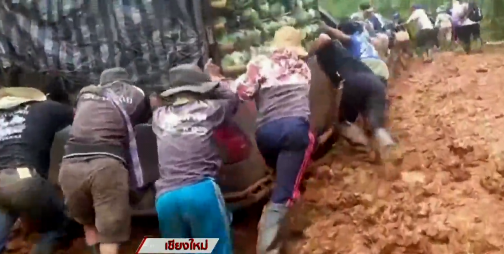 ชาวบ้านขุนแม่รวม ต.แจ่มหลวง อ.กัลยานิวัฒนา จ.เชียงใหม่ รวมพลังความสามัคคี ช่วยกันลากรถกระบะขับเคลื่อน 4 ล้อ ที่บรรทุกกะหล่ำปลีมาเต็มคัน เพื่อจะนำไปขายใน อ.แม่แจ่ม ซึ่งมีระยะทางเพียง 80 กิโลเมตร แต่ช่วงนี้ฝนตกซุก ทำให้เส้นทางที่ออกจากหมู่บ้านสุดหฤโหด เป็นทะเลโคลน และเป็นทางขึ้นเขาลาดชัน รถไม่สามารถขับเคลื่อนผ่านจุดนี้ไปได้ ต้องระดมกำลังคนทั้งหมู่บ้านมาช่วยกันชักลาก ใช้เวลานานกว่า 3 ชั่วโมง