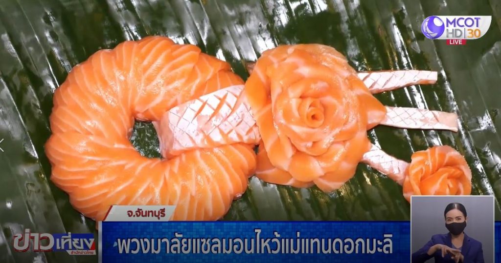 อีกหนึ่งสีสันวันแม่ ที่เชื่อว่าใครเห็นต้องอดยิ้มไม่ได้ เพราะร้านแซลมอนจันท์ ใน จ.จันทบุรี ร้านอาหารสไตล์ญี่ปุ่น ทำเมนูอาหารในวันแม่ที่สามารถนำไปเป็นของขวัญให้แม่แทนพวงมาลัยดอกมะลิที่มีราคาสูงได้ อีกทั้งของขวัญชิ้นนี้ยังสามารถรับประทานได้ทั้งครอบครัว ก็คือ “พวงมาลัยปลาแซลมอน”