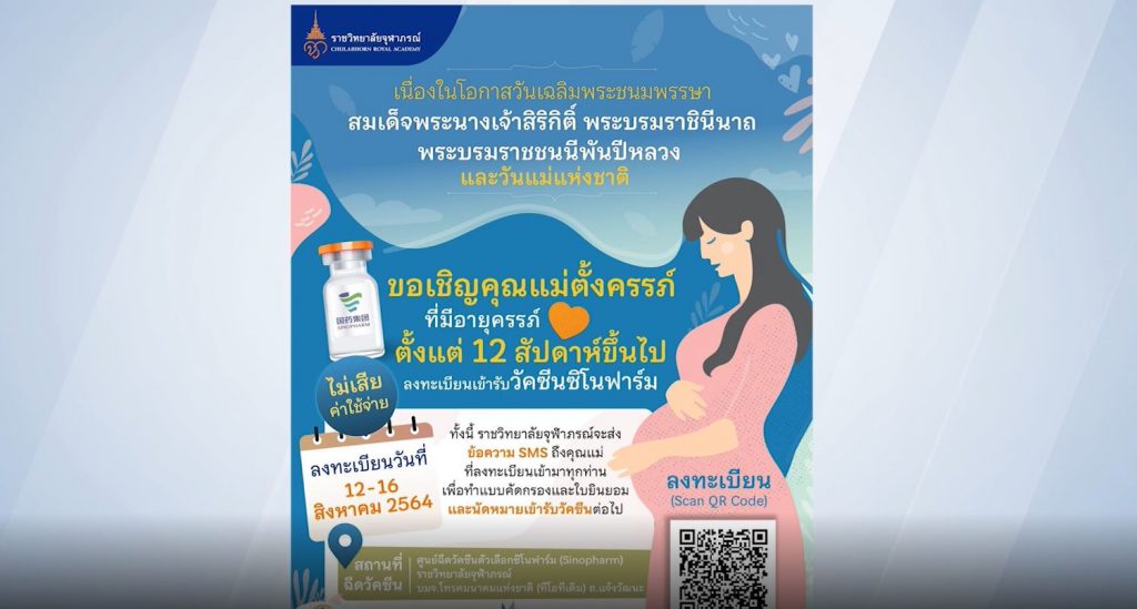 ด้านราชวิทยาลัยจุฬาภรณ์ เชิญชวนคุณแม่ตั้งครรภ์ที่มีอายุครรภ์ตั้งแต่ 12 สัปดาห์ขึ้นไป ลงทะเบียนเข้ารับวัคซีนซิโนฟาร์ม โดยไม่เสียค่าใช้จ่าย ตั้งแต่วันนี้ (12 ส.ค.) ถึงวันที่ 16 สิงหาคมนี้ ผ่านทาง LINE Official รพ.จุฬาภรณ์ จากนั้นราชวิทยาลัยจุฬาภรณ์จะส่งข้อความ SMS ถึงคุณแม่ที่ลงทะเบียน ให้เข้ามาดำเนินการทำแบบคัดกรองและใบยินยอม และนัดหมายการเข้ารับวัคซีนต่อไป เงื่อนไขการเข้ารับสิทธิ์ เป็นคุณแม่ตั้งครรภ์ต้องมีอายุครรภ์ตั้งแต่ 12 สัปดาห์ขึ้นไป ข้ารับบริการที่ศูนย์ฉีดวัคซีนตัวเลือกซิโนฟาร์ม บริษัท โทรคมนาคมแห่งชาติ จำกัด (มหาชน) อาคาร 9 (ทีโอทีเดิม) ถนนแจ้งวัฒนะ เท่านั้น ในวันฉีดวัคซีนกรุณานำเอกสารการฝากครรภ์ และบัตรประจำตัวประชาชน เพื่อแสดงเป็นหลักฐานในการเข้ารับบริการฉีดวัคซีน