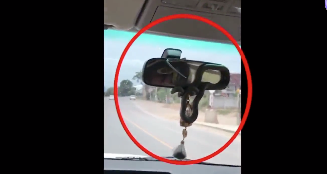 ภาพวีดีโอจากโทรศัพท์มือถือบันทึกภาพ งูเขียวขนาดใหญ่ไม่รู้มาจากไหน เกาะอยู่ที่กระจกมองหลังภายในรถ หญิงสาวที่นั่งหน้าข้างคนขับตกใจร้องเสียงหลงด้วยความกลัว ส่วนเพื่อนสาวที่นั่งอยู่เบาะหลังหยิบโทรศัพท์มาถ่ายภาพ พร้อมบอกให้เพื่อนรีบเปิดประตูออกจากรถแทบไม่ทัน จากนั้นได้แจ้งศูนย์วิทยุหน่วยกู้ภัยมูลนิธิสว่างแผ่ไพศาลธรรมสถานปราณบุรี ให้มาช่วยจับงูอยู่ในรถ ที่จอดบริเวณตีนสะพานต่างระดับข้ามทางรถไฟรางคู่ ก่อนถึงโรงพยาบาลปราณบุรีประมาณ 100 เมตร ต.วังก์พง อ.ปราณบุรี จ.ประจวบคีรีขันธ์
