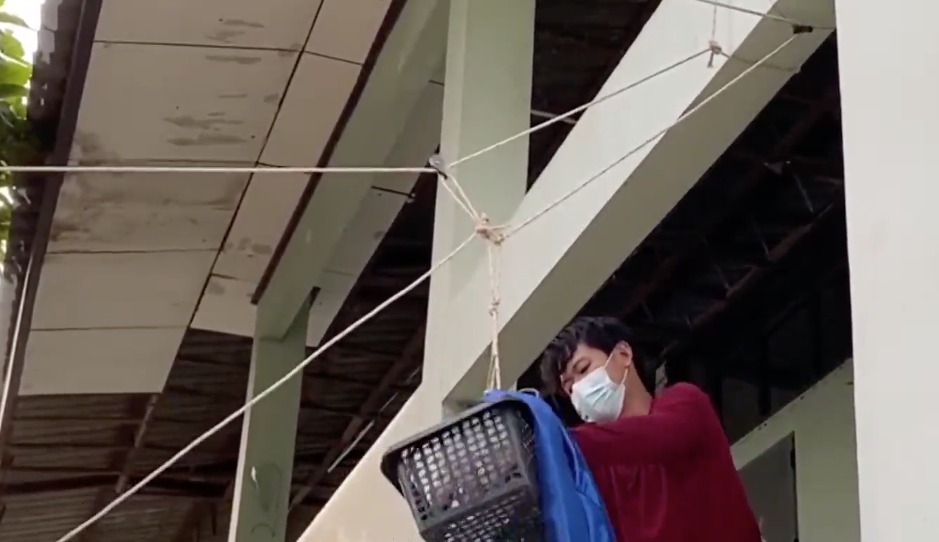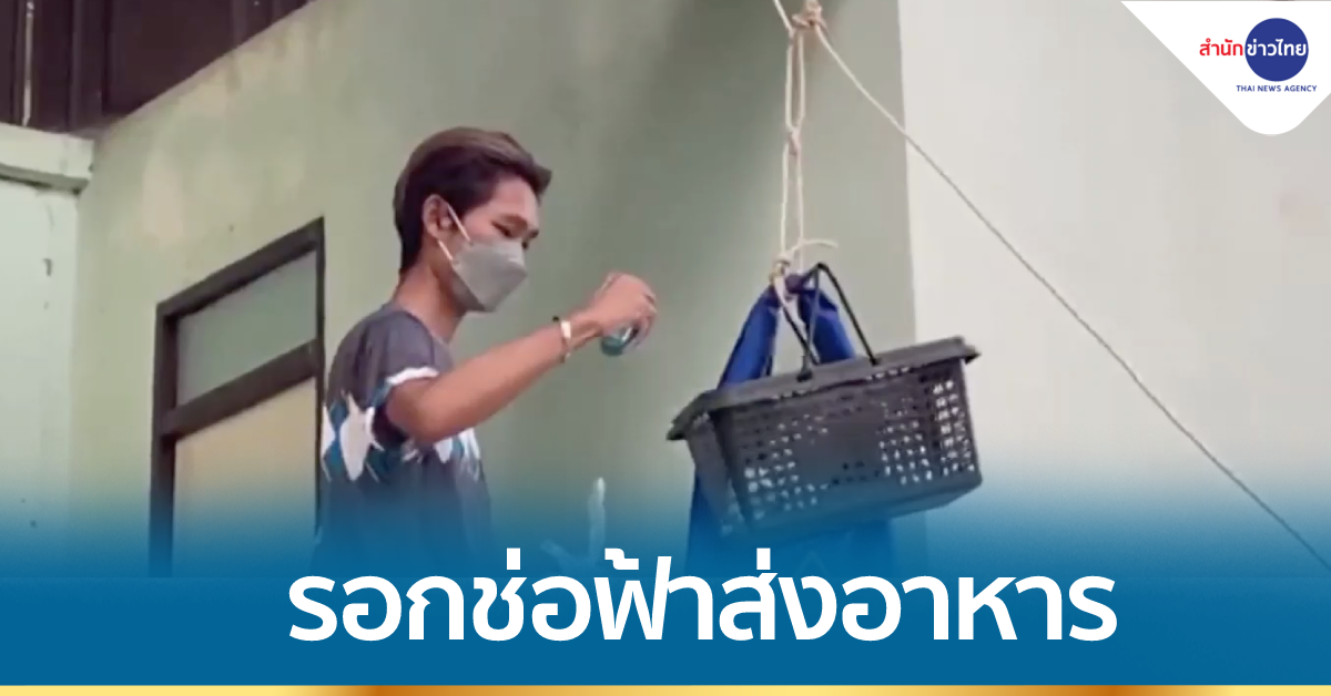 พิจิตร 16 ส.ค.- ที่ศูนย์กักตัว บริเวณโรงเรียนวัดหนองจอก จ.พิจิตร นำแนวคิดการยกช่อฟ้าโบสถ์ตามภูมิปัญญาชาวบ้าน มาปรับประยุกต์ใช้ส่งเสบียงอาหารผู้กักตัวโควิด-19 เพื่อลดความเสี่ยงสัมผัสผู้ติดเชื้อ