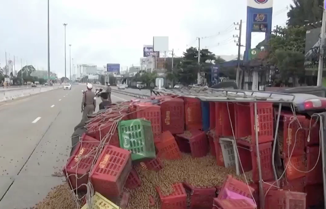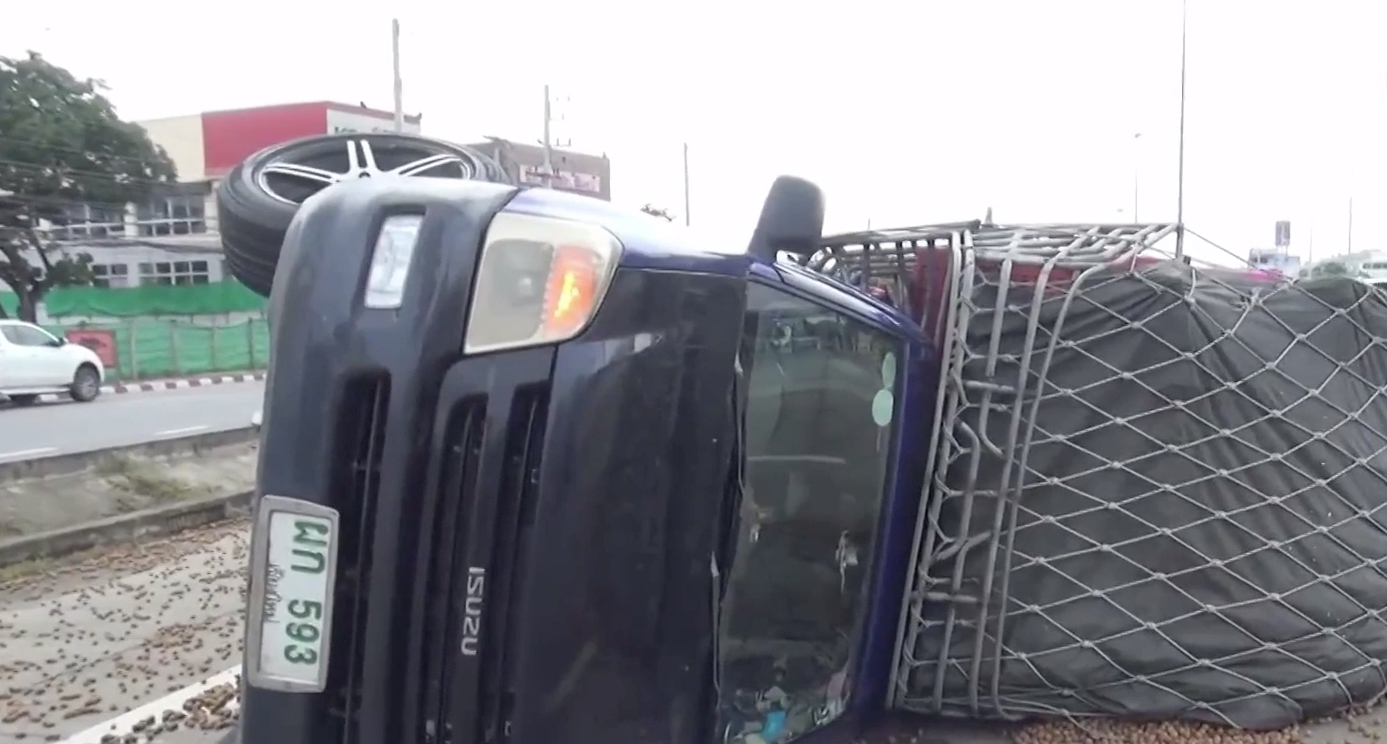 นายมะเนตร มุตุระ คนขับบาดเจ็บเล็กน้อย เล่าว่าบรรทุกลำไยสด 150 ตะกร้า หนักกว่า 3 ตัน จากอำเภอแม่แตง จังหวัดเชียงใหม่ เพื่อนำไปส่งให้กับล้งรับซื้อที่จังหวัดลำพูน ขณะขับลอดใต้อุโมงค์หนองประทีป ประมาณ 300 เมตร ยางหลังเกิดระเบิดจนควบคุมรถไม่ได้ เนื่องจากบรรทุกหนัก ทำให้รถพลิกคว่ำ ตำรวจต้องช่วยเก็บกวาดลำไยที่ตกเกลื่อนถนนใส่ในตะกร้า และเร่งเคลื่อนย้ายรถ เพื่อกลับมาเปิดเส้นทางจราจรให้วิ่งได้ตามปกติโดยเร็ว เบื้องต้นเชื่อว่าสาเหตุน่าจะมาจากบรรทุกน้ำหนักเกิน จนยางล้อระเบิด.-สำนักข่าวไทย