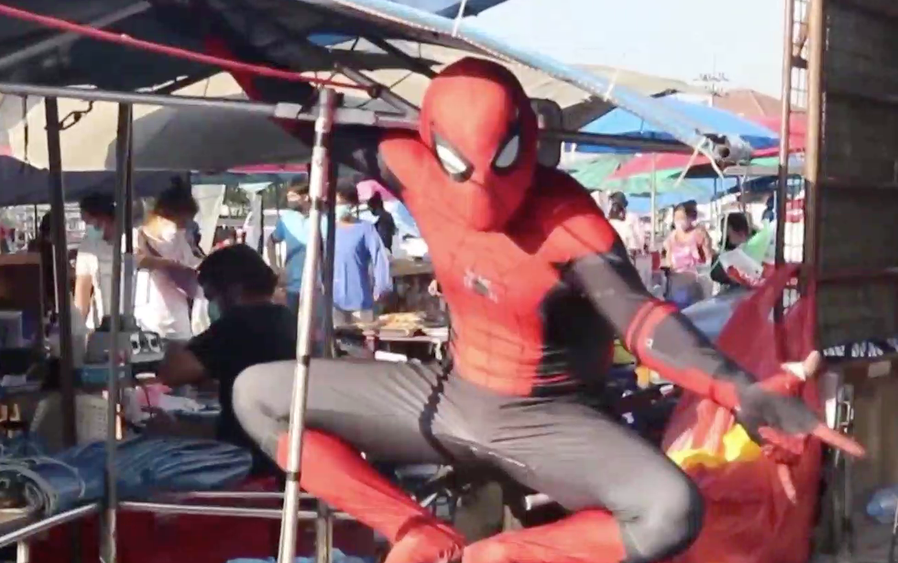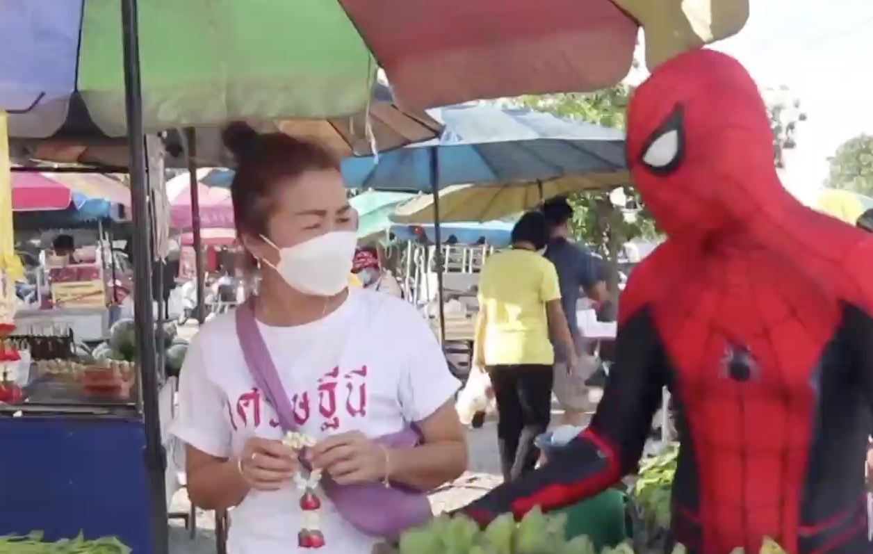 สไปเดอร์แมนขายผลไม้อยู่ที่ตลาดนัดแห่งหนึ่ง ต.สนามชัย อ.เมือง จ.สุพรรณบุรี ขณะผู้สื่อข่าวลงพื้นที่ ได้พบกับสไปเดอร์แมนที่กำลังเดินขายกล้วยอยู่กลางตลาดนัด ทราบชื่อคือนายมนตรี โพธิ์ทอง จึงไปพูดคุยถึงที่มาที่ไปของการแต่งชุดฮีโร่มาเดินขายผลไม้ตามตลาดนัด