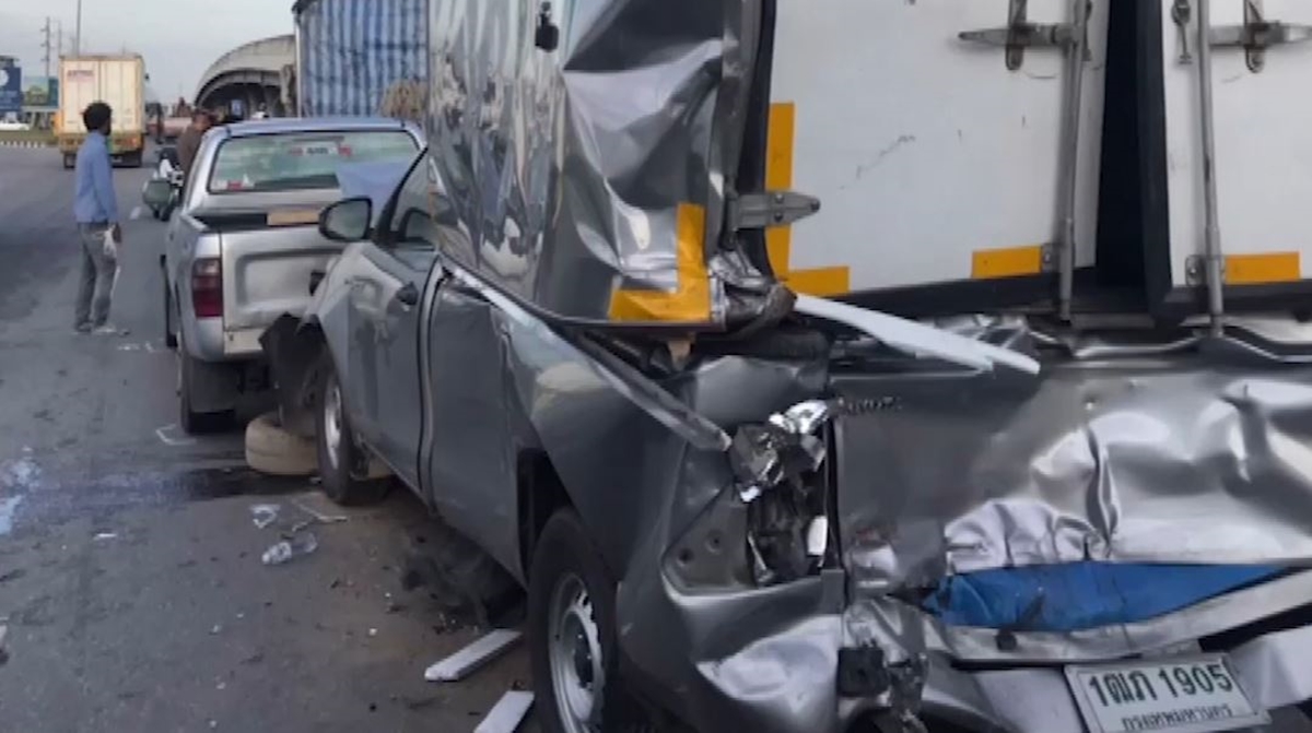 กล้องวงจรปิดบันทึกภาพขณะรถบรรทุก 6 ล้อ พุ่งชนรถกระบะที่จอดรอสัญญาณไฟเขียวอย่างแรง จนกระเด็นไปพุ่งชนรถกระบะอีก 2 คัน และรถเก๋ง 1 คัน ผู้โดยสารที่นั่งหลังกระบะกระเด็น ได้รับบาดเจ็บเล็กน้อย 1 ราย เหตุเกิดเมื่อช่วงเย็นวานนี้ (24 ส.ค.) บริเวณแยกบ้านบึงพัฒนา อ.บ้านบึง จ.ชลบุรี