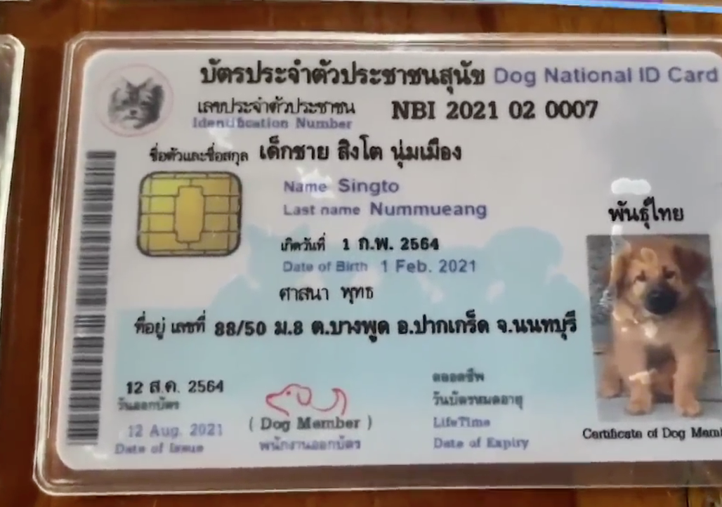 จ่าสิบเอกทองใบ บอกว่าตนเองได้จัดทำบัตรประชาชนน้องหมาจำนวน 500 ใบ โดยในบัตรประชาชนน้องหมาจะมีการระบุชื่อของน้องหมาทุกตัว ไม่ว่าจะเป็นชื่อ อายุ รวมทั้งนามสกุลของเจ้าของน้องหมา ที่อนุญาตให้ใส่ชื่อ โดยใช้นามสกุลของเจ้าของน้องหมาแทบทุกราย จุดประสงค์ในการจัดทำบัตรประจำตัวประชาชนน้องหมาในครั้งนี้ ก็เพื่อต้องการให้คนที่เลี้ยงน้องหมาทุกคน มีความรับผิดชอบ ช่วยกันดูแลควบคุม หากน้องหมาหายไป ไม่สบาย ก็สามารถนำไปรักษาที่คลินิกสัตวแพทย์ได้เลย.-สำนักข่าวไทย
