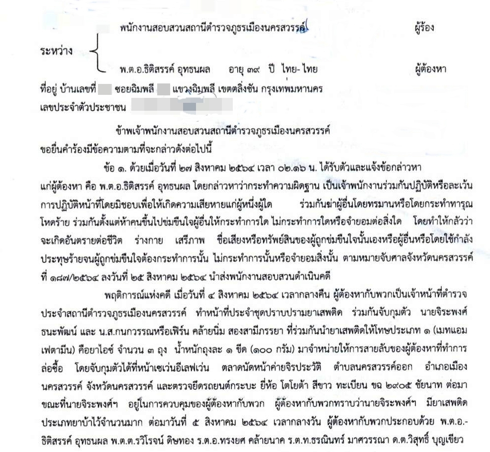 สำหรับ พ.ต.อ.ธิติสรรค์ ถูกควบคุมตัวจากกองปราบปราม กทม.มาส่งให้พนักงานสอบสวน สภ.เมืองนครสวรรค์ เมื่อเวลา 02.16 น.วันนี้ (27 ส.ค.) และถูกแจ้งข้อหาว่า กระทำความผิดฐาน เป็นเจ้าพนักงานร่วมกันปฏิบัติหรือละเว้นการปฏิบัติหน้าที่โดยมิชอบ เพื่อให้เกิดความเสียหายแก่ผู้หนึ่งผู้ใด , ร่วมกันฆ่าผู้อื่นโดยทรมานหรือโดยกระทำทารุณโหดร้าย, ร่วมกันตั้งแต่ห้าคนขึ้นไปข่มขืนใจผู้อื่นให้กระทำการใด ไม่กระทำการใตหรือจำยอมต่อสิ่งใด โดยทำให้กลัวว่าจะเกิดอันตรายต่อชีวิต ร่างกาย เสรีภาพ ชื่อเสียงหรือทรัพย์สินของผู้ถูกข่มขืนใจนั้นเองหรือผู้อื่นหรือโดยใช้กำลังประทุษร้ายจนผู้ถูกข่มขืนใจต้องกระทำการนั้น ไม่กระทำการนั้นหรือจำยอมสิ่งนั้น ตามหมายจับศาลจังหวัดนครสวรรค์ที่ 187/2564 ลงวันที่ 25 สิงหาคม 2564.-สำนักข่าวไทย