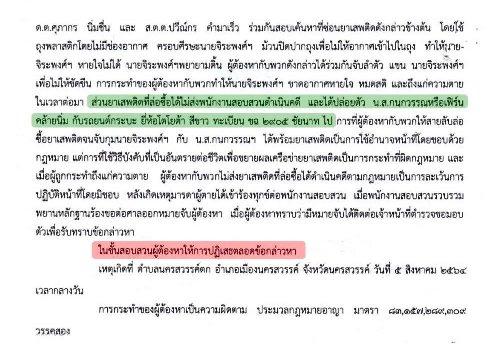 สำหรับรายละเอียดอื่นๆ ที่น่าสนใจจากคำร้องฝากขังวันนี้ ยังมีอีกหลายประเด็น เช่น พนักงานสอบสวนระบุในคำร้องฝากขังว่า ก่อนที่ตำรวจแก๊งนี้จะก่อเหตุใช้ถุงดำคลุมหัวผู้ต้องหาตามที่ปรากฎในคลิปวิดีโอ ได้มีการให้สายลับล่อซื้อยาเสพติดจากผู้ตายเมื่อวันที่ 4 ส.ค.64 เวลากลางคืน เมื่อนายจิระพงศ์ ธนะพัฒน์ ผู้ตาย พร้อมด้วย น.ส.กนกวรรณ หรือเฟิร์น คล้ายนิ่ม แฟนสาว ขับรถกระบะนำยาไอซ์ จำนวน 3 ถุง น้ำหนักถุงละ 100 กรัม มาส่งให้กับสายลับที่บริเวณหน้าร้านสะดวกซื้อ ใกล้ตลาดนัดหน้าค่ายจิรประวัติ อ.เมืองนครสวรรค์ จึงถูกตำรวจชุด 05 ลูกน้องของอดีต ผกก.โจ้ จับกุมพร้อมตรวจยึดยาไอซ์ของกลางและรถยนต์กระบะ นำตัวไปควบคุม และสอบปากคำจนทราบว่าผู้ตายยังมียาบ้าอีกเป็นจำนวนมาก