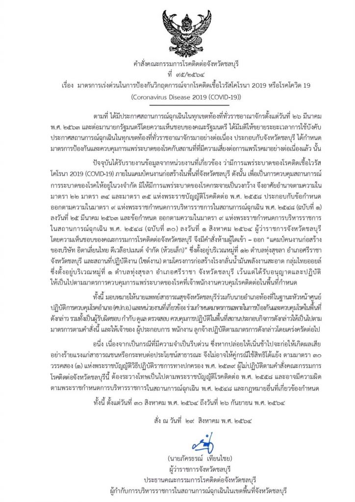 นายภัครธรณ์ เทียนไชย ผู้ว่าราชการจังหวัดชลบุรี ประธานคณะกรรมการควบคุมโรคติดต่อจังหวัดชลบุรี ผู้กำกับการบริหารในสถานการณ์ฉุกเฉินในเขตพื้นที่จังหวัดชลบุรี ออกคำสั่งคณะกรรมการโรคติดต่อจังหวัดชลบุรี ที่ 95/2564 ลงวันที่ 29 ส.ค.2564