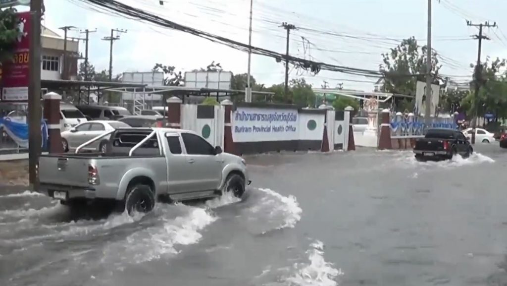 ที่ บุรีรัมย์ เกิดฝนตกหนักในเขตเทศบาลเมืองบุรีรัมย์ ต่อเนื่องนานกว่า 1 ชั่วโมง ทำให้น้ำเอ่อท่วมขังถนนหลายสายในเขตเทศบาลเมืองบุรีรัมย์ สูงกว่า 30–50 เซนติเมตร ส่งผลให้ประชาชนสัญจรไปมาด้วยความลำบาก โดยเฉพาะที่สถานีตำรวจภูธรเมืองบุรีรัมย์ เป็นพื้นที่ลุ่มต่ำมีน้ำท่วมสูงกว่า 50 เซนติเมตร น้ำยังได้ท่วมลานจอดรถและทางเดินภายในสถานีตำรวจ