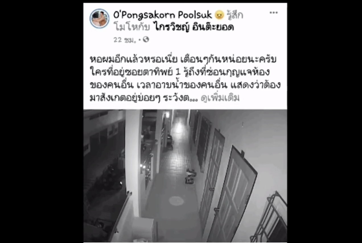 ผู้โพสต์เฟซบุ๊กชื่อ O’Pongsakorn Poolsuk โพสต์ข้อความว่า#เตือนภัยชาวหอ มีโจรขโมยหรือโรคจิตใช่มีแต่ผู้ชาย..หอผมอีกแล้วหรอเนี่ย เตือนๆ กันหน่อยนะครับใครที่อยู่ซอยตาทิพย์ 1 รู้ถึงที่ซ่อนกุญแจห้องของคนอื่น เวลาอาบน้ำของคนอื่น แสดงว่าต้องมาสังเกตอยู่บ่อยๆ ระวังตัวกันด้วยนะครับ ถ้าเป็นไปได้อยากจะให้ช่วยกันหาตัวคนคนนี้ วันที่โดนถ่ายเราก็ปล่อยให้เค้าเดินผ่านไปหน้าตาเฉย เพราะคิดว่าเป็นเพื่อนของพี่ข้างห้อง ใครมีเบาะแสก็แจ้งกันนะครับ เราจะได้จบเรื่องนี้สักที ทุกวันนี้ระแวงไปหมด ทั้งตอนอาบน้ำ ทั้งตอนนอน อันนี้เป็นห้องของคนที่อยู่หอเดียวกันโดน เพิ่งโดนไปกับตัวเมื่อวันที่ 19 ก็ไม่คิดว่ามันจะกล้ากลับมาหอนี้อีกนาน