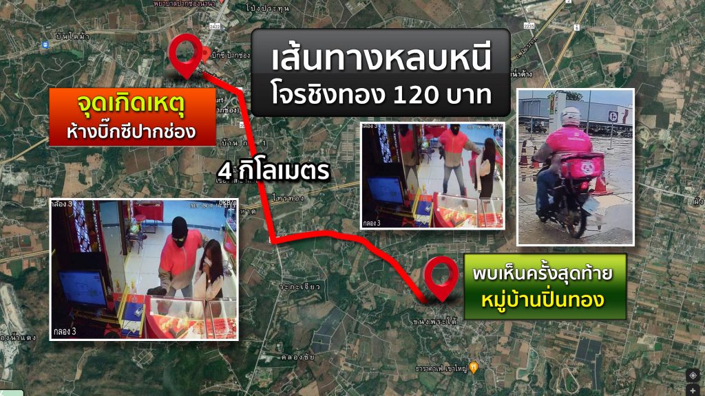 สำหรับพฤติการณ์ของคนร้ายรายนี้ ใส่ชุดฟู้ดแพนด้าและมีลักษณะคล้ายสวมเสื้อเกราะภายในด้วย สวมหมวกโม่งสีดำใส่แว่นตากันแดด เดินเข้าไปในร้านห้างเพชรทองเยาวราชในห้างบิ๊กซีปากช่อง ประมาณ 16.30 น. เมื่อวานนี้ มีพนักงานหญิง 3 คน คนร้ายถือกระเป๋าส่งสินค้าวางบนตู้ใส่ทอง จากนั้นเปิดกระเป๋าหยิบขวดพลาสติกขึ้นมาวางบนโต๊ะและจุดไฟแช็กที่ขวดจนเกิดควัน ก่อนเดินเข้าไปเอาปืนจี้หัวพนักงานหญิงของร้านและบังคับให้พนักงานทุกคนกวาดทองจากถาดในตู้โชว์ใส่กระเป๋า เมื่อเจ้าของร้านได้ยินเสียงจึงรีบวิ่งออกมาดูอาศัยช่วงที่คนร้ายเผลอวิ่งเข้าไปล็อกคอคนร้าย แต่คนร้ายกลับใช้ปืนยิงใส่ที่บริเวณต้นแขนซ้ายทะลุชายโครงหลัง แล้วเดินไปหยิบทองใส่กระเป๋าเพิ่มก่อนจะเดินออกจากร้านไปอย่างใจเย็น ไปที่รถจักรยานยนต์ฮอนด้าเวฟ สีขาว ที่จอดอยู่ประตูด้านหลัง ขี่หลบหนีออกประตูด้านหลังของห้างออกถนนบายพาสไป