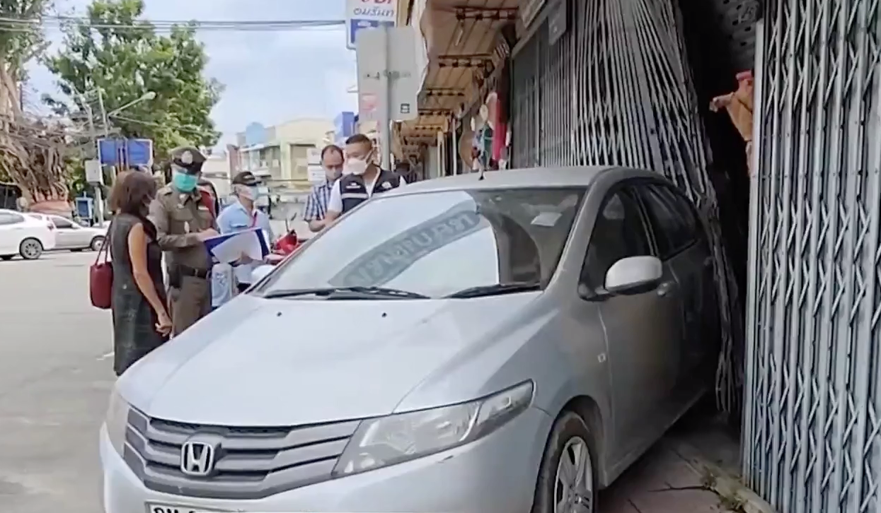 เมื่อตำรวจเข้าตรวจสอบที่เกิดแหตุพบนางกาญจนา ศิลปี อายุ 73 ปี เจ้าของรถเก๋งยืนอยู่ด้วยอาการตกใจ สภาพรถเก๋งบริเวณท้ายรถปีนขึ้นไปอยู่บนทางเท้า พุ่งชนประตูเหล็กร้านเอี่ยวเฮง ร้านขายอุปกรณ์การเกษตรได้รับความเสียหาย ประตูเหล็กพัง บริเวณล้อรถด้านหน้าข้างซ้ายยางแตกไม่สามารถขับต่อได้
