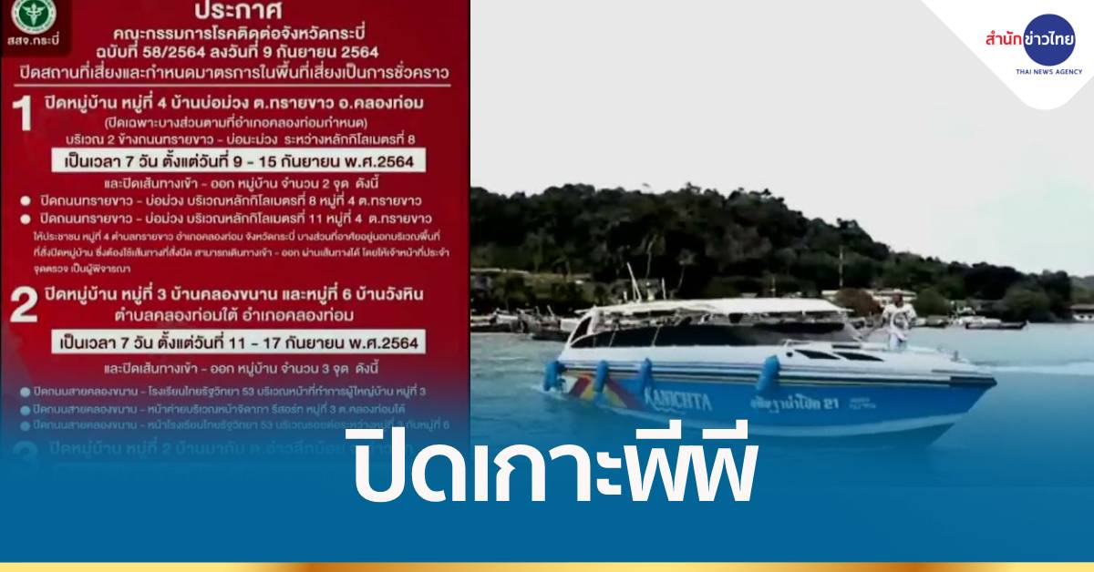 คณะกรรมการโรคติดต่อจังหวัดกระบี่ ออกประกาศปิดการเข้าออกพื้นที่ เกาะพีพี ม.7 ต.อ่าวนาง และ ม.8 บ้านแหลมตง ต.อ่าวนาง อ.เมืองกระบี่ เป็นเวลา 7 วัน ตั้งแต่วันที่ 11-17 กันยายน ยกเว้นนักท่องเที่ยวผ่านโครงการภูเก็ตแซนด์บ็อกซ์ยังสามารถเดินทางได้ตามปกติ โดยผ่านเส้นทางเดินเรือของโครงการ