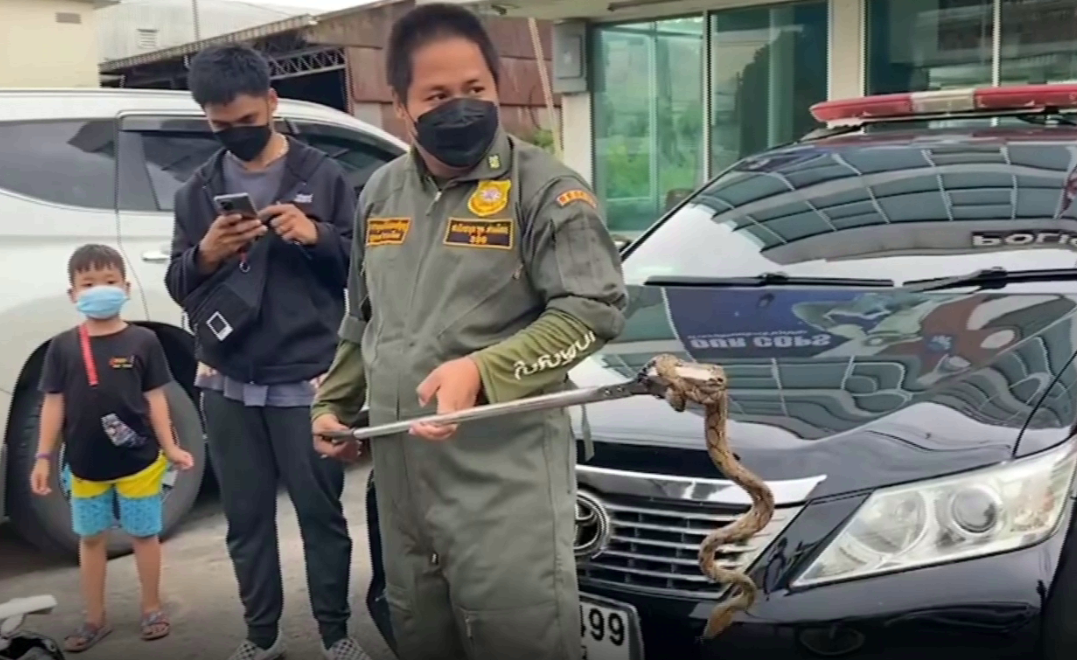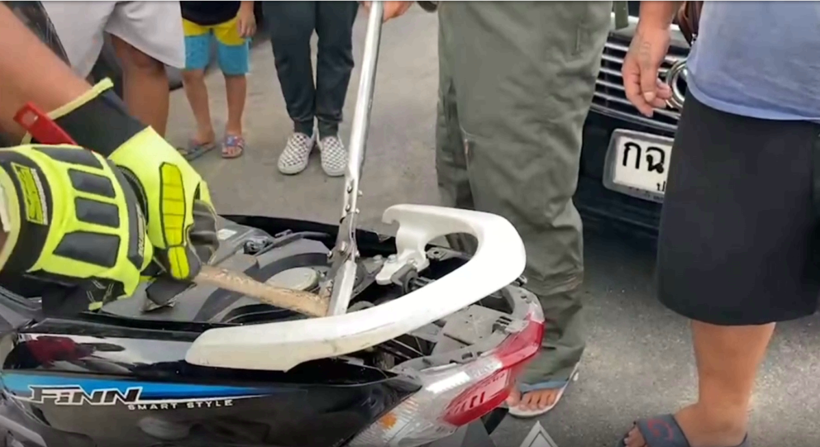 ซึ่งนายนพพล สมานมิตร อายุ 23 ปี หนุ่มไรเดอร์เจ้าของรถ ยืนอยู่ด้วยอาการตกใจบริเวณใกล้รถจักรยานยนต์ ยามาฮ่า สีดำ หมายเลขทะเบียน 7กถ-4235 กรุงเทพมหานคร พร้อมบอกกับเจ้าหน้าที่กู้ภัยฯว่า ในรถมีงูอยู่บริเวณใต้เบาะ