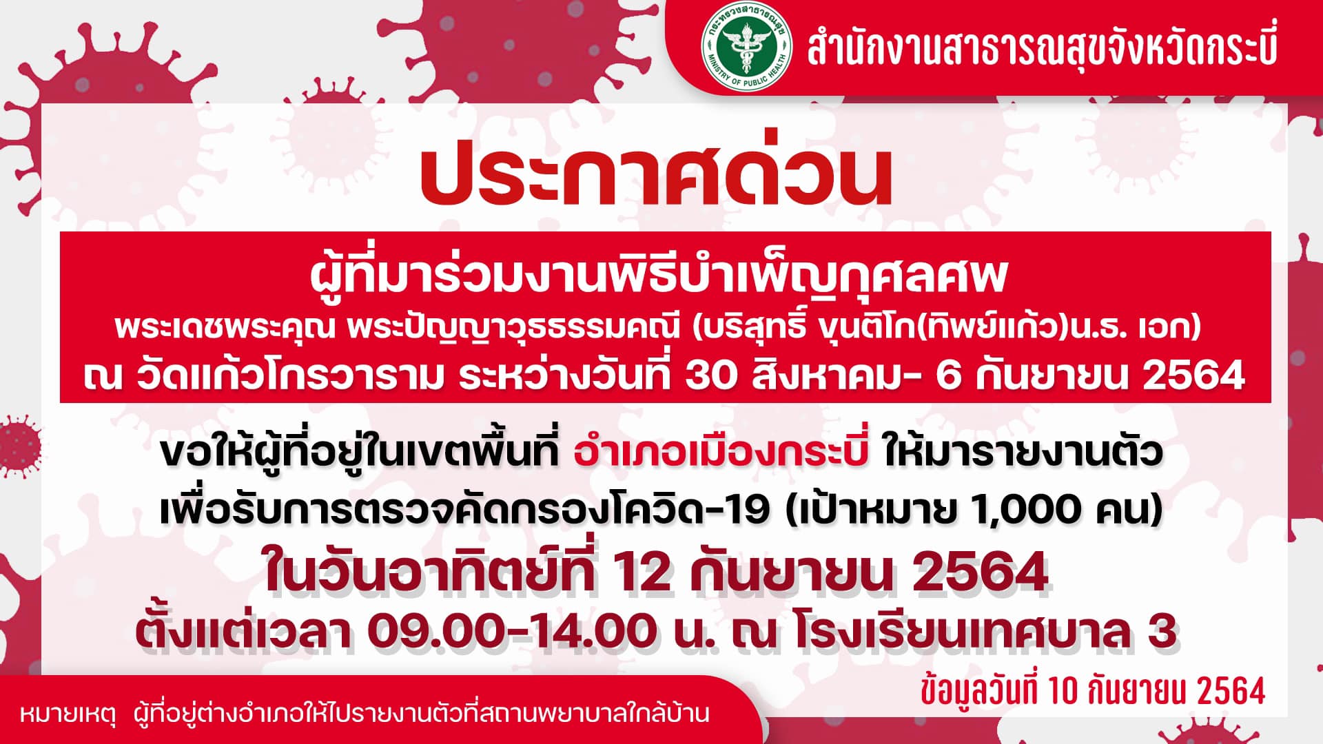 วันที่ 11 ก.ย.64 สำนักงานสาธารณสุข จ.กระบี่ ได้ออกประกาศด่วนให้ผู้ที่ร่วมพิธีบำเพ็ญกุศลศพ พระปัญญาวุธ ธรรมคณี อดีตเจ้าอาวาสวัดแก้วโกรวาราม พระอารามหลวง อ.เมือง จ.กระบี่ ณ วัดแก้วฯ ระหว่างวันที่ 30 สิงหาคม – 6 กันยายน 2564 ให้มารายงานตัวเพื่อรับการตรวจคัดกรองโควิด-19 ที่โรงเรียนเทศบาล3 ท่าแดง เทศบาลเมืองกระบี่ ในวันอาทิตย์ที่ 12 ก.ย.64 นี้ เวลา 09.00-14.00 น. หลังพบผู้ที่เข้าร่วมพิธีในช่วงเวลาดังกล่าวติดเชื้อแล้ว จำนวน 36 ราย และพบกลุ่มสัมผัสเสี่ยงสูงและเสี่ยงต่ำ จำนวนกว่า 1,000 คน โดยเจ้าหน้าที่ปฏิบัติการควบคุมโรคติดต่อสาธารณสุข อ.เมืองกระบี่ ได้คัดกรอง พระ และเณร ภายในวัด ที่มีอยู่ประมาณ 100 รูป เพื่อตรวจหาเชื้อโควิด-19 และทำการกักตัวเป็นเวลา 14 วัน