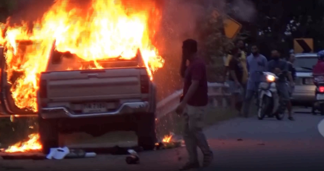 ร.ต.อ.มานิจ (ขอสงวนนามสกุล) ข้าราชการตำรวจบำนาญที่เป็นเจ้าของรถ เล่าว่าขับรถมาคนเดียวตามถนนสถลมาร์คเพื่อกลับบ้าน ระหว่างนั้นมองเห็นประกายไฟจากสวิตช์ที่ใช้เปิด-ปิดแอร์รถ ก่อนเกิดกลุ่มควันขึ้นในตัวรถ ตนเองรีบประคองสติ นำรถเลี้ยวเข้าข้างทาง เปิดฝากระโปรง ถอดขั้วบวกออกจากแบตเตอรี่รถ อย่างไรก็ตามแม้จะตั้งสติได้แต่ก็ไม่ทันการณ์ เพราะไฟได้ลุกไหม้บริเวณแผงหน้าปัดและคอนโซลรถ ที่เป็นพลาสติกไปแล้วก่อนลุกไหม้รถจนวอดเสียหายทั้งคัน ส่วนรถคันนี้ไม่ได้ติดแก๊ส แต่ใช้น้ำมันดีเซล ซึ่งหากสันนิษฐานคาดว่าเกิดไฟลัดวงจรที่ควบคุมสวิทช์แอร์
