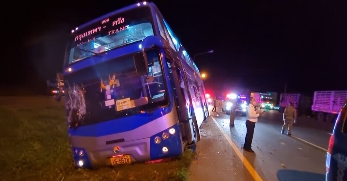 สอบถามนายสุรินทร์ สินสมบูรณ์ อายุ 58 ปี พนักงานขับรถ บขส. บอกว่า ออกเดินทางจาก จ.ตรัง เวลา 17.00 น. มุ่งหน้า กทม. เมื่อมาถึงที่เกิดเหตุ ก็ขับตามปกติ สังเกตเห็นรถบรรทุกคู่กรณี อยู่ๆ ก็ขับเบียดด้านข้าง จนรถเสียหลัก ตนจึงรีบเบรก แต่เอาไม่อยู่ รถตกลงในร่องกลางถนน ส่วนรถบรรทุกคู่กรณีขับหลบหนีไป