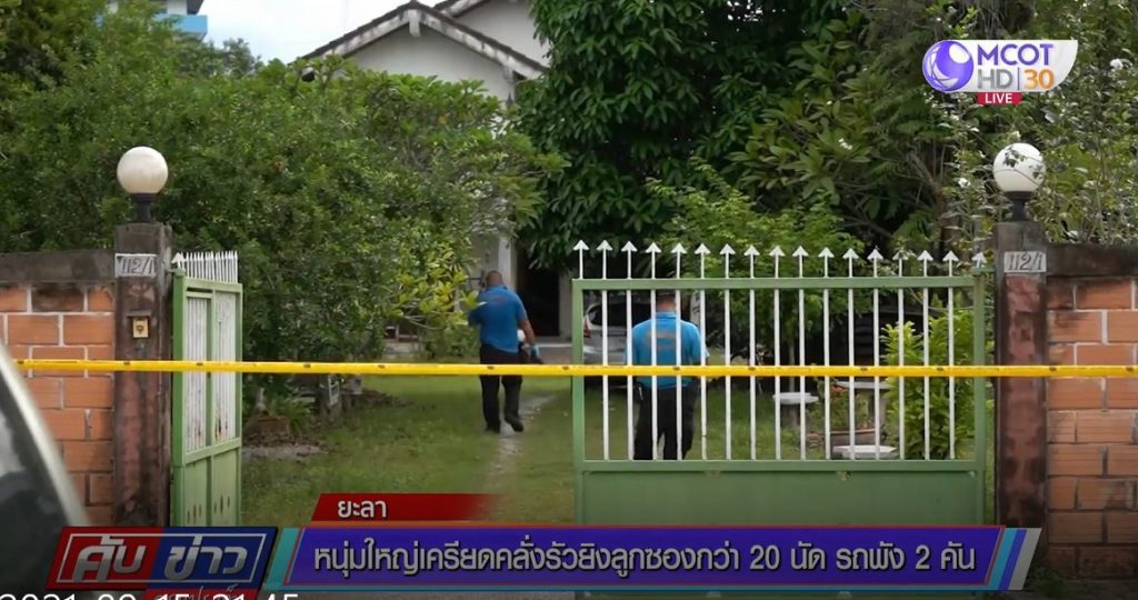 นี่เป็นคลิปเหตุการณ์เกิดขึ้นที่บ้านเลขที่ 112/1 ถนนธนวี ตำบลสะเตง อำเภอเมือง จังหวัดยะลา ซึ่งเพื่อนบ้านบันทึกไว้ได้ เป็นนาทีผู้ชายใช้อาวุธปืนยิงภายในบริเวณบ้าน และมีหญิงสูงอายุวิ่งเอามืออุดหูสองข้างออกมาจากบริเวณบ้าน