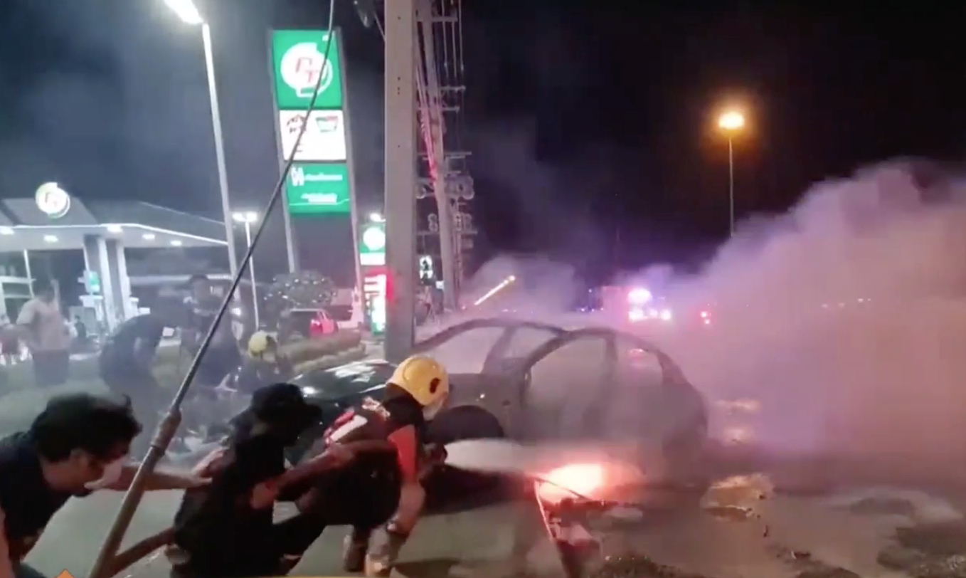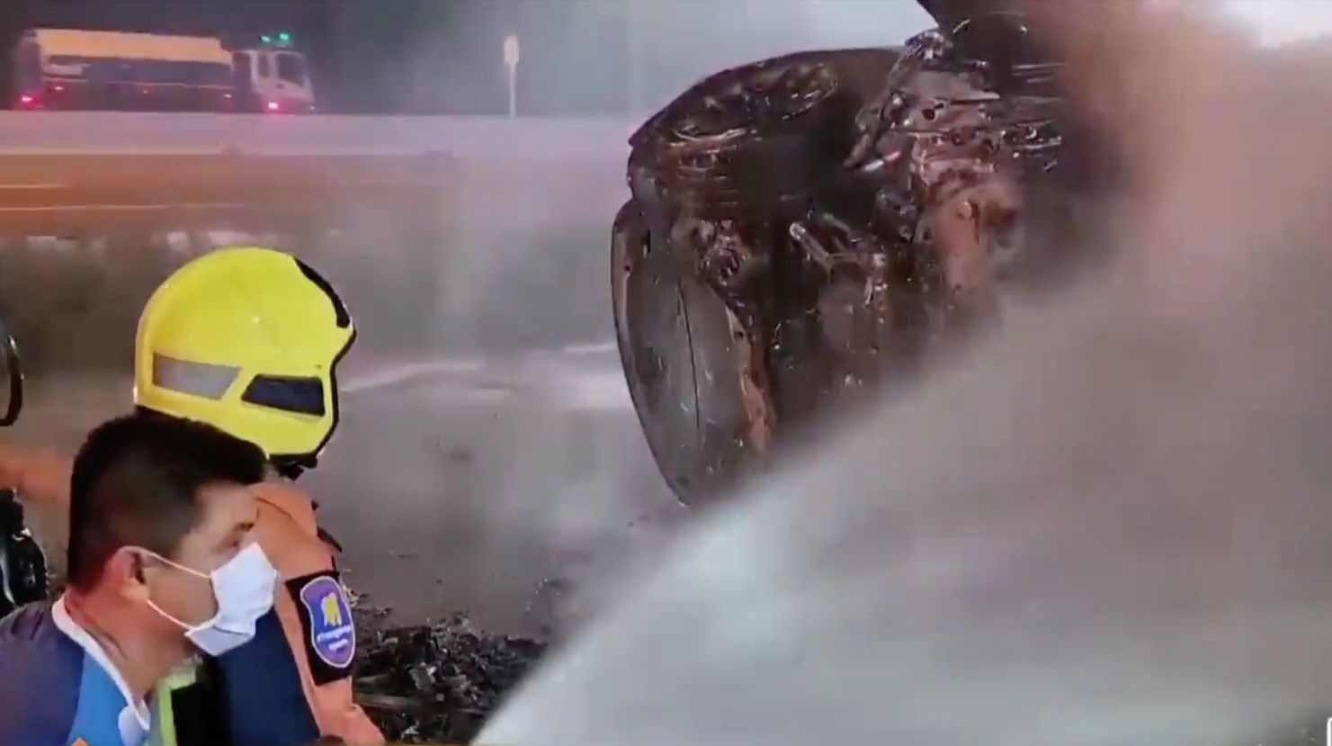 เจ้าหน้าที่พยายามฉีดน้ำสกัดเพลิงที่โหมลุกไหม้รถยนต์ไฟฟ้าหรู ราคากว่า 4 ล้านบาท ซึ่งชนเข้ากับเสาไฟฟ้าแรงสูง ริมถนนพระราม 2 กิโลเมตรที่ 55 ขาล่องใต้ บริเวณหน้าปั๊มน้ำมันพีที หมู่ 6 ตำบลบางแก้วอำเภอเมือง จังหวัดสมุทรสงคราม ใช้เวลาเกือบ 1 ชั่วโมงก็ยังไม่สามารถควบคุมเพลิงได้ เนื่องจากเพลิงลุกไหม้ใต้ท้องรถ ซึ่งเป็นแผงแบตเตอรี่ ต้องใช้รถจูงลากรถให้ตะแคง เพื่อฉีดน้ำใส่ใต้ท้องรถ จึงสามารถดับได้ แต่เพลิงก็ยังระอุอยู่ภายใน ส่วนคนขับได้รับบาดเจ็บจากการกระแทกเล็กน้อย ถูกนำตัวส่งโรงพยาบาลมหาชัยแม่กลอง