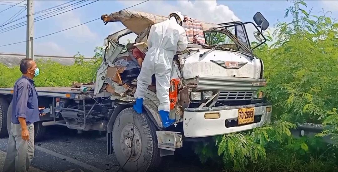 เกิดเหตุรถบรรทุก 10 ล้อ ชนกับเรือโป๊ะที่อยู่บนรถบรรทุก 22 ล้อ บริเวณโค้งโรงงานไม้อัด ถนนศาลายา – บางภาษี หมู่ 11 ต.ลำพญา อ.บางเลน จ.นครปฐม เจ้าหน้าที่เข้าตรวจสอบที่เกิดเหตุเป็นโค้งหักศอก ช่องทางขาเข้ากรุงเทพ พบรถบรรทุก 10 ล้อ ทะเบียนนครราชสีมา สภาพด้านหน้าพังยับ มีผู้ขับขี่ติดอยู่ในห้องโดยสาร ได้รับบาดเจ็บสาหัส เจ้าหน้าที่ต้องเอาเครื่องตัดถ่าง งัดนำร่างผู้บาดเจ็บออกมา ใช้เวลากว่า 20 นาที จึงสามารถช่วยได้สำเร็จ ก่อนนำส่ง รพ.หลวงพ่อเปิ่น ทราบชื่อคือ นายสวัสดิ์ เฉลียงกลาง อายุ 53 ปี ชาวนครราชสีมา