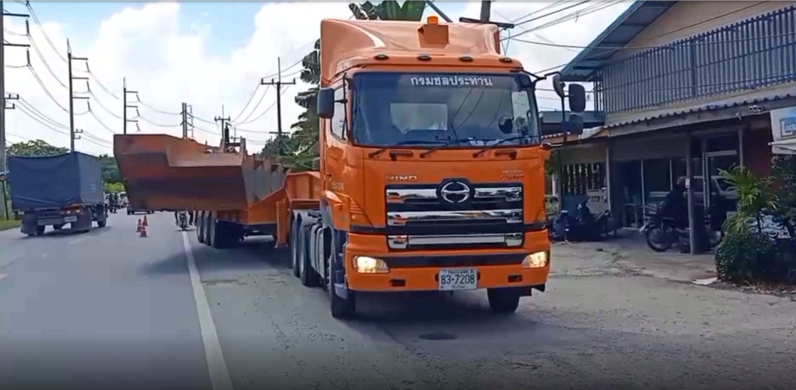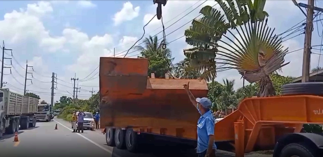 ใกล้กันพบรถบรรทุกเทเลอร์ 22 ล้อ ทะเบียนเชียงใหม่ ด้านหน้าติดสติกเกอร์กรมชลประทาน ท้ายรถบรรทุกเรือโป๊ะ เพื่อใช้ในการขุดลอกคูคลองตามภารกิจของกรมชลประทาน สภาพเรือโป๊ะยื่นออกจากตัวรถ ด้านข้างเรือมีรอยเฉี่ยวชน ส่วนคนขับรถเทเลอร์ คือ นายสง่า มะสอ อายุ 58 ปี ยืนอยู่ข้างรถ รอให้การกับตำรวจ ระบุว่า เรือโป๊ะของกรมชลประทาน ซึ่งเสร็จภารกิจการลอกคลองจากบางคูวัดที่ จ.นนทบุรี กำลังจะเคลื่อนย้ายไปที่คลองพระพิมล แต่พอมาถึงที่เกิดเหตุ ซึ่งเป็นช่วงโค้งหักศอก ทำให้เรือโป๊ะเคลื่อนออกจากตัวรถ ซึ่งเป็นจังหวะที่รถบรรทุก 10 ล้อวิ่งสวนมา จึงเกิดการเฉี่ยวชนกับเรือโป๊ะ ผู้ขับขี่รถ 10 ล้อ ได้รับบาดเจ็บสาหัส และต้องนำรถเครนมายกเรือโป๊ะให้วางอยู่บนรถเทเลอร์ตามปกติ