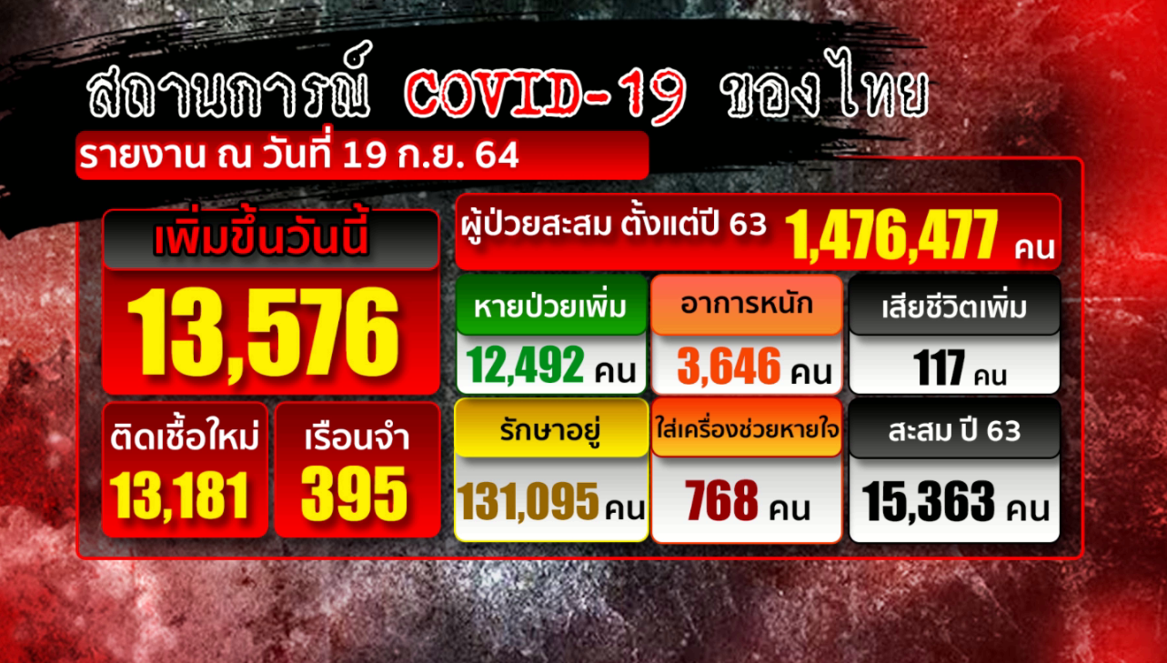 สำหรับตัวเลขผู้ติดเชื้อรายใหม่ในประเทศวันนี้ มีทั้งสิ้น 13,576 คน เสียชีวิต 117 คน เสียชีวิต 117 คน รวมผู้ป่วยยืนยันสะสมในประเทศตั้งแต่ต้นปี 2563 ถึงล่าสุดอยู่ที่ 1,476,477 คน เสียชีวิตสะสม 15,363 คน.-สำนักข่าวไทย