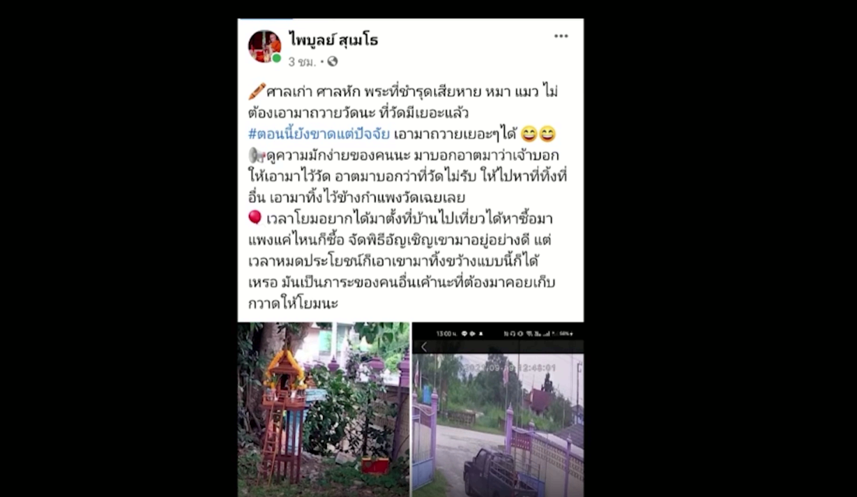 เฟซบุ๊กชื่อไพบูลย์ สุเมโธ โพสต์ข้อความว่า “ศาลเก่า ศาลหัก พระที่ชำรุดเสียหาย หมา แมว ไม่ต้องเอามาถวายวัดนะ ที่วัดมีเยอะแล้ว #ตอนนี้ยังขาดแต่ปัจจัย เอามาถวายเยอะๆ ได้ ดูความมักง่ายของคนนะ มาบอกอาตมาว่าเจ้าบอกให้เอามาไว้วัด อาตมาบอกว่าที่วัดไม่รับ ให้ไปหาที่ทิ้งที่อื่น เอามาทิ้งไว้ข้างกำแพงวัดเฉยเลย เวลาโยมอยากได้มาตั้งที่บ้านไปเที่ยวได้หาซื้อมาแพงแค่ไหนก็ซื้อ จัดพิธีอัญเชิญเขามาอยู่อย่างดี แต่เวลาหมดประโยชน์ก็เอาเขามาทิ้งขว้างแบบนี้ก็ได้เหรอ มันเป็นภาระของคนอื่นเขานะที่ต้องมาคอยเก็บกวาดให้โยมนะ” พร้อมกับรูปรถกระบะที่บรรทุกศาลพระภูมิเก่าวิ่งเอาเข้ามาทิ้งไว้ข้างกำแพงวัด ก่อนจะขับรถหนีออกไป