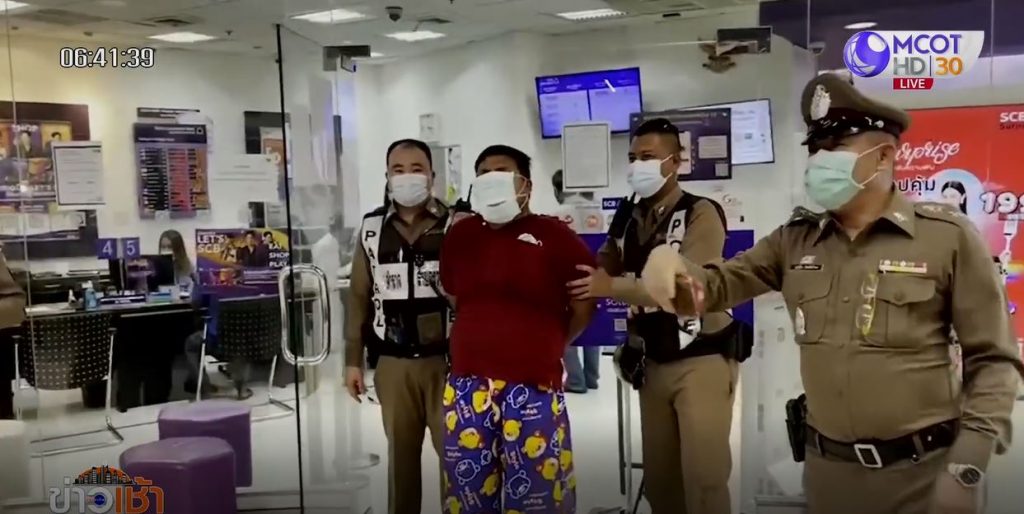 อย่างไรก็ตาม ระหว่างนั้นคนร้ายเดินวนไปมาและบอกว่าผ่านไป 2 นาทีแล้ว จากนั้นคนร้ายพยายามพังกระจกบริเวณทางเข้าเคาน์เตอร์ แต่ไม่สามารถเข้าไปได้ เดินวนไปมา ก่อนตำรวจจะมาถึงและจับตัวได้ในที่สุด