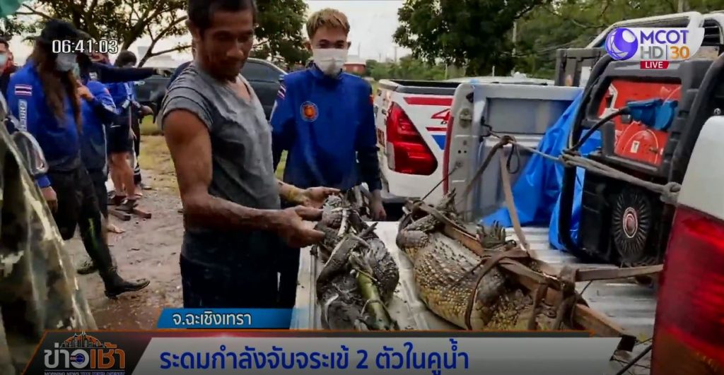 ฉะเชิงเทรา 22 ก.ย. – ยังไม่หมดจระเข้เมืองแปดริ้ว กู้ภัยฉะเชิงเทราได้รับแจ้งให้ไปจับจระเข้ในคูน้ำข้างทางเดิมที่เคยจับได้ เจ้าหน้าที่ระดมค้นหาจับได้ 2 ตัว ความยาว 1.55 เมตร และ 1.38 เมตร ส่วนอีกคูน้ำเดิมที่กำลังค้นหา เกิดฝนตกลงมา ทำให้ต้องยุติการค้นหา