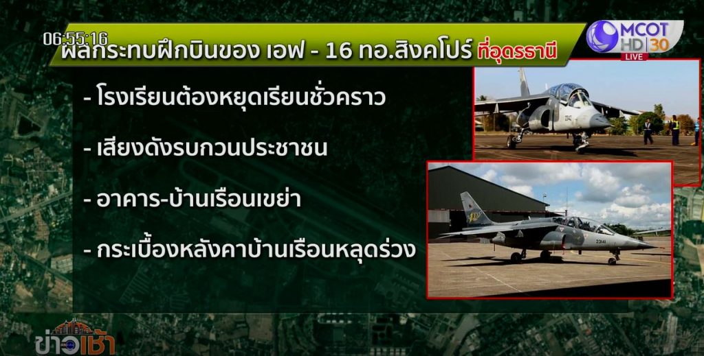อุดรธานี 23 ก.ย. – กรรมาธิการการต่างประเทศลงพื้นที่จี้กองบิน 23 อุดรธานี แก้ปัญหาเครื่องบินรบ F-16 ของสิงคโปร์ ซ้อมบินเสียงดัง เดือดร้อนชาวบ้าน โรงเรียนต้องหยุดเรียนชั่วคราว เพราะเสียงเครื่องบินรบกวนเด็กนักเรียน