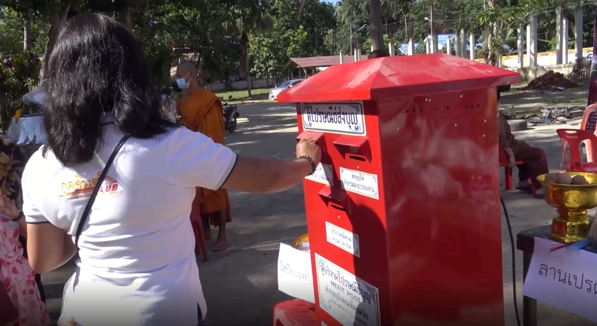 สงขลา 23 ก.ย.- พาไปดูตู้ไปรษณีย์ส่งบุญ ตู้แรกหนึ่งเดียวในจังหวัดสงขลา ลักษณะเหมือนตู้ไปรษณีย์ส่งจดหมาย บนตู้จะเจาะช่อง หากต้องการทำบุญแบบไหน ก็เอาเงินทำบุญไปหย่อนใส่ช่องนั้นๆ