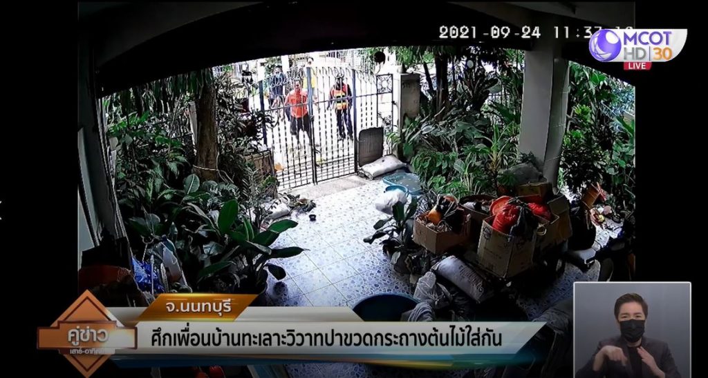 ภาพจากกล้องวงจรปิดบ้านเลขที่ 300/428 หมู่3 ต.บางรักพัฒนา อ.บางบัวทอง จ.นนทบุรี บันทึกเหตุการณ์เมื่อวันที่ 24 กันยายน ขณะเกิดเหตุทะเลาะวิวาทกัน ระหว่างนางศิริพร อายุ 71 ปี อดีตครูเกษียณอายุราชการ กับเพื่อนบ้านที่อยู่ติดกัน ซึ่งปาขวด กระถางต้นไม้ และถุงขยะ เข้าไปในบ้าน ทำให้ทรัพย์สินเสียหาย