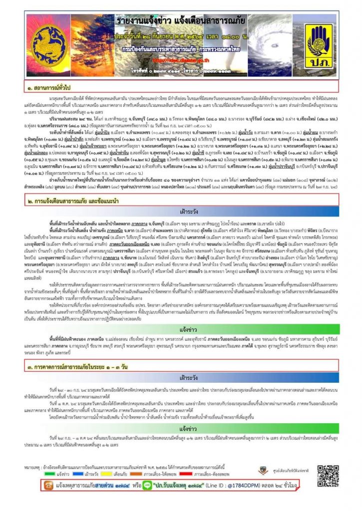 สำนักข่าวไทย 28 ก.ย.-อย่าเพิ่งวางใจ! ปภ.แจ้งเตือนประชาชนในพื้นที่ภาคเหนือ อีสาน กลาง และตะวันออก รวม 23 จังหวัด เฝ้าระวังติดตามสถานการณ์น้ำอย่างใกล้ชิดในช่วงนี้ โดยเฉพาะจันทบุรีและตราด ขอให้เฝ้าระวังพื้นที่อาจเกิดน้ำท่วมฉับพลันและน้ำป่าไหลหลาก