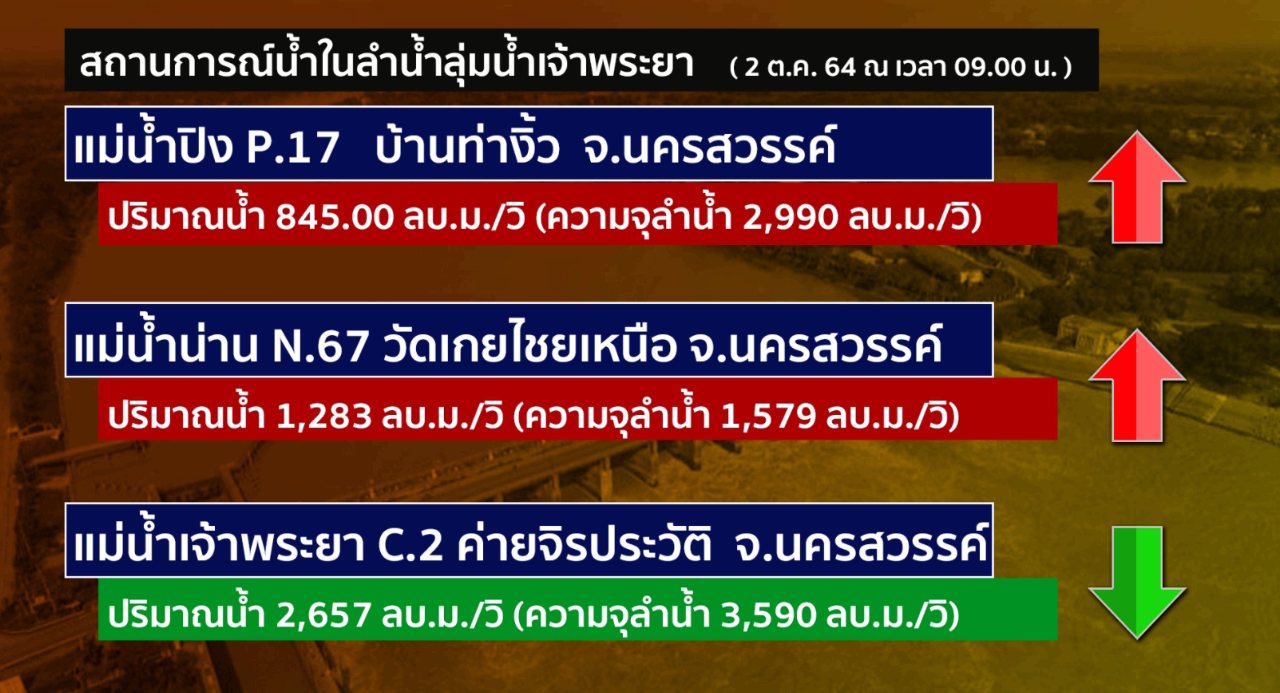 แม่น้ำน่าน N.67 วัดเกยไชยเหนือ อ.ชุมแสง จ.นครสวรรค์ แนวโน้มเพิ่มขึ้น ระดับน้ำ 27.15 ม. (ระดับตลิ่ง 28.30 ม.) ปริมาณน้ำ 1,283 ลบ.ม./วิ (ความจุลำน้ำ 1,579 ลบ.ม./วิ)