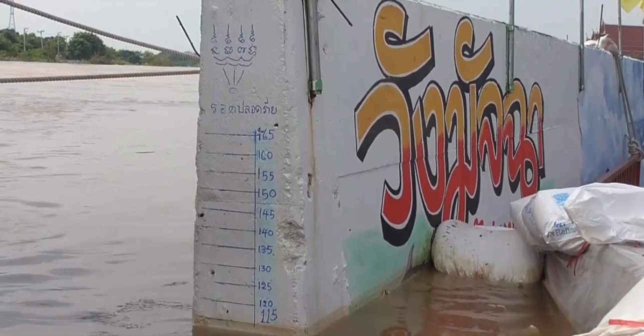 จุดวัดระดับน้ำซึ่งเขียนด้วยปากกาเมจิสีน้ำเงินพร้อมยันต์และอักษรคำว่า “รอดปลอดภัย” ถูกเขียนไว้บริเวณเสาพนังคอนกรีต ริมแม่น้ำเจ้าพระยา ด้านหน้าวัดสนามชัย ต.ตลาดหลวง อ.เมือง จ.อ่างทอง ซึ่งเป็นจุดที่ระดับน้ำสูงกว่าพื้นถึง 1.50 เมตร โดยพระสงฆ์ ชาวบ้าน และเจ้าหน้าที่เทศบาลเมืองอ่างทอง ตั้งแนวกระสอบทรายป้องกันน้ำไว้ แต่ยังมีน้ำไหลทะลุพนังคอนกรีตหลายจุด บริเวณดังกล่าวเป็นจุดเสี่ยงที่ต้องเฝ้าระวังอย่างใกล้ชิด เนื่องจากเป็นพื้นที่ท้ายตลาดอ่างทอง ซึ่งเป็นพื้นที่เศรษฐกิจจุดที่ต่ำ และเป็นโค้งน้ำทำให้น้ำไหลแรงกว่าปกติ