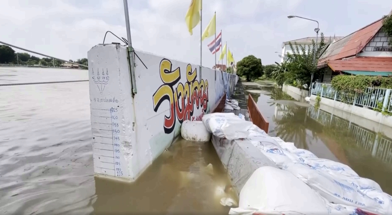 แต่ที่ อ.ไชโย กันไม่ไหว พนังคอนกรีตริมแม่น้ำเจ้าพระยาในชุมชนบ้านบางน้ำวน หมู่ที่ 3 ต.จรเข้ร้อง ทรุดตัวลงกว่า 20 เมตร น้ำทะลักท่วมบ้านเรือนประชาชนในหมู่ที่ 2,3,4,5,6 กว่า 200 หลัง อย่างรวดเร็ว โดยเฉพาะบ้านเรือนริมฝั่งแม่น้ำเจ้าพระยา บางจุดน้ำท่วมสูงกว่า 1.5 เมตร เทศบาลตำบลไชโย และชาวบ้านต่างเร่งนำรถแบ็กโฮและเครื่องมือหนักพยายามนำลูกรัง แท่งปูนขนาดใหญ่เข้าไปชะลอน้ำ แต่การทำงานยากลำบากเนื่องจากกระแสน้ำที่ไหลบ่าอย่างรุนแรง