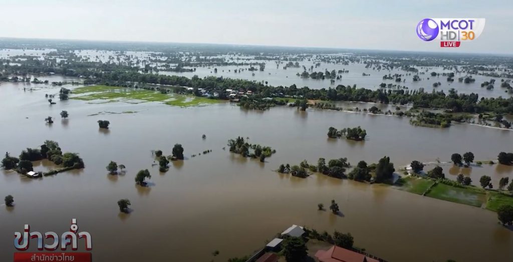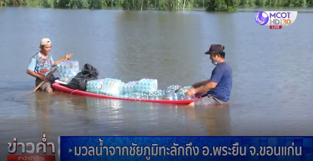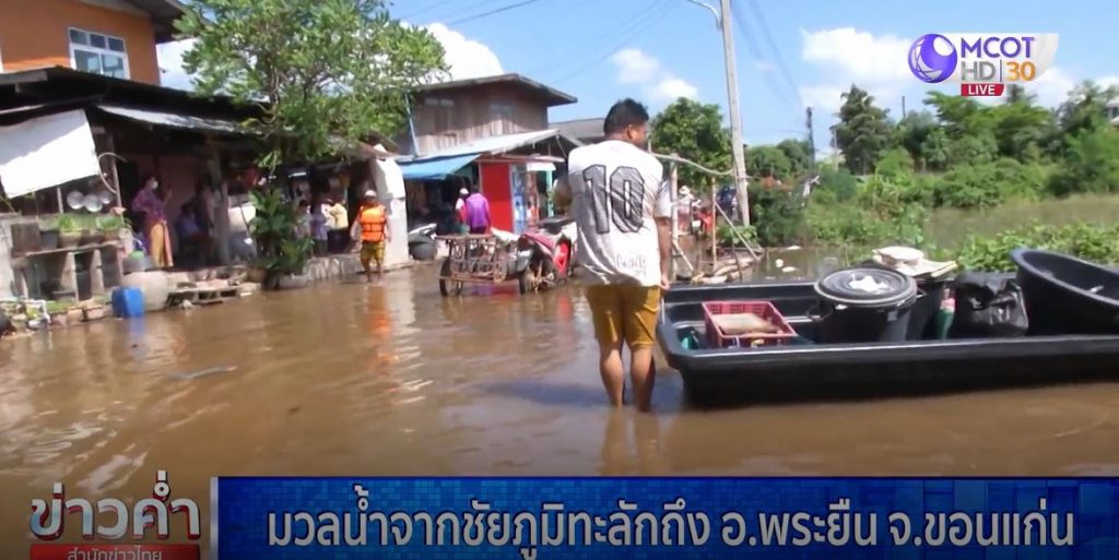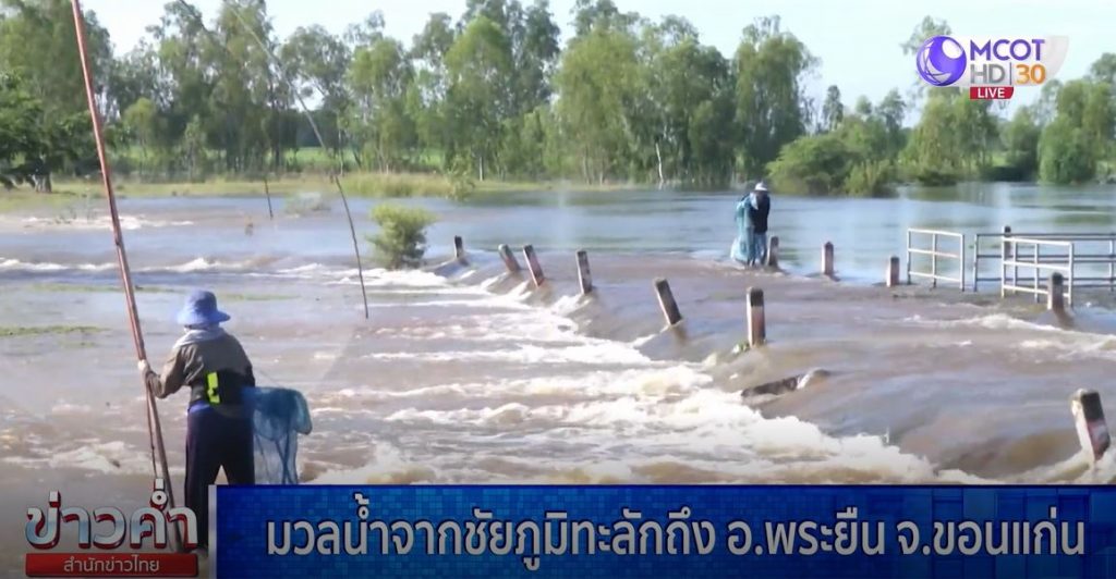 ก่อนจะมาถึงจุดนี้ ทีมข่าวตระเวนดูสถานการณ์น้ำท่วมหลายจุดด้วยกัน เช่น การไหลบ่าของมวลน้ำผ่านอ่างเก็บน้ำบ้านหนองโพธิ์ อำเภอพระยืน จังหวัดขอนแก่น ช่วงเช้า เปรียบเทียบกับช่วงบ่ายจะเห็นได้ว่าน้ำได้เพิ่มระดับขยายวงท่วมอย่างรวดเร็ว ล่าสุดถนนเส้นนี้รถไม่สามารถสัญจรผ่านได้แล้ว สอดคล้องข้อมูลของสำนักงานชลประทานจังหวัดขอนแก่น ที่ระบุว่าระดับน้ำเพิ่มสูงขึ้นเฉลี่ยชั่วโมงละ 5-7 เซนติเมตร คาดการณ์ว่าน้ำจะเพิ่มสูงสุดในวันพรุ่งนี้ และจะทรงอยู่ 1-2 วัน จากนั้นจะทยอยลดลง แต่จะต้องไม่มีฝนตกลงมาเพิ่ม