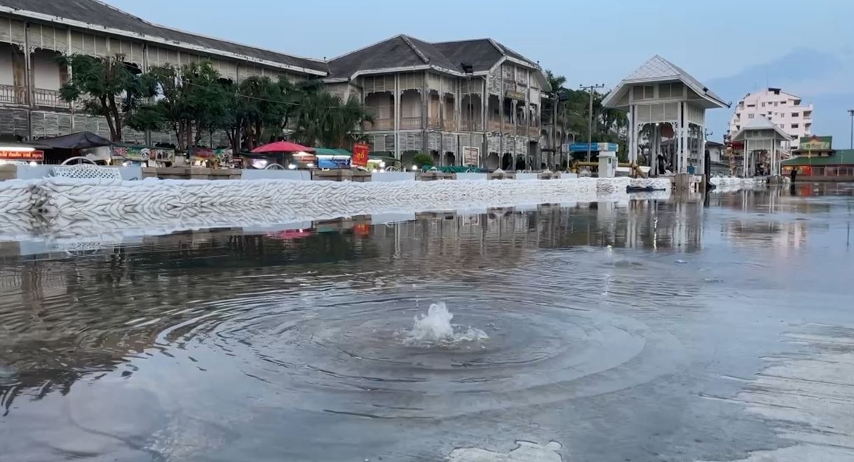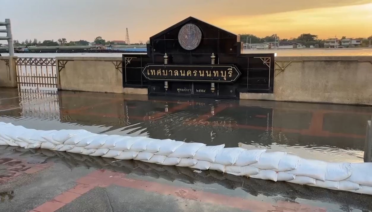 น้ำผุดขึ้นมาจากพื้นลานปูนหลายจุด บริเวณท่าน้ำนนท์ จ.นนทบุรี สร้างความตื่นตกใจให้กับชาวบ้าน กลัวว่าแรงดันน้ำจะทะลักขึ้นมา และเกิดแผ่นปูนระเบิดอย่างรวดเร็ว เนื่องจากระดับน้ำบริเวณดังกล่าวเพิ่มสูงขึ้นทุกวัน ขณะที่เจ้าหน้าที่สำนักป้องกันและบรรเทาสาธารณภัย เทศบาลนครนนทบุรี ได้นำกระสอบบรรจุทรายมาวางเพิ่ม พร้อมเดินเครื่องสูบน้ำเต็มกำลัง