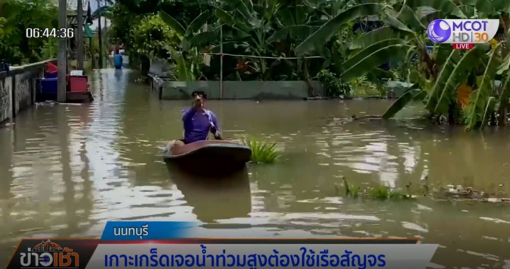ช่วงเย็นวานนี้ ผู้สื่อข่าวลงพื้นที่บริเวณหมู่ 5 และหมู่ 6 ต.เกาะเกร็ด อ.ปากเกร็ด จ.นนทบุรี พบน้ำไหลเชี่ยวสูงจากพื้นถนนประมาณ 40-45 เซนติเมตร ชาวบ้านต้องใช้เรือท้องแบนพายไปทำงาน ส่วนคนที่ไม่มีเรือต้องเดินลุยน้ำด้วยความยากลำบาก