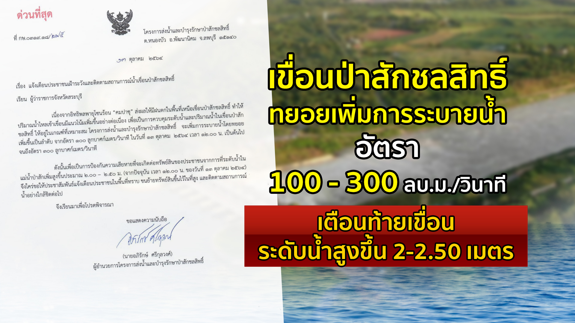 วันนี้ (13 ต.ค.64) นายอภิรักษ์ ศรีกุลวงศ์ ผู้อำนวยการโครงการส่งน้ำและบำรุงรักษาป่าสักชลสิทธิ์ ส่งหนังสือด่วนที่สุด ถึงผู้ว่าราชการจังหวัดสระบุรี เรื่อง แจ้งเตือนประชาชนเฝ้าระวังและติดตาม สถานการณ์น้ำเขื่อนป่าสักชลสิทธิ์ เนื่องจากอิทธิพลพายุโซนร้อน “คมปาซุ” ส่งผลให้มีฝนตกในพื้นที่เหนือเขื่อนป่าสักชลสิทธิ์ ทำให้ปริมาณน้ำไหลเข้าเขื่อนมีแนวโน้มเพิ่มขึ้นอย่างต่อเนื่อง เพื่อเป็นการควบคุมระดับน้ำและปริมาณน้ำในเขื่อนป่าสักชลสิทธิ์ ให้อยู่ในเกณฑ์ที่เหมาะสม โครงการส่งน้ำและบำรุงรักษาป่าสักชลสิทธิ์ จะเพิ่มการระบายน้ำโดยทยอยเพิ่มขึ้นเป็นลำดับจากอัตรา 100 ลบ.ม./วินาที ในวันที่ 13 ต.ค.2564 เวลา 12.00 น. เป็นต้นไป จนถึงอัตรา 300 ลบ.ม./วินาที