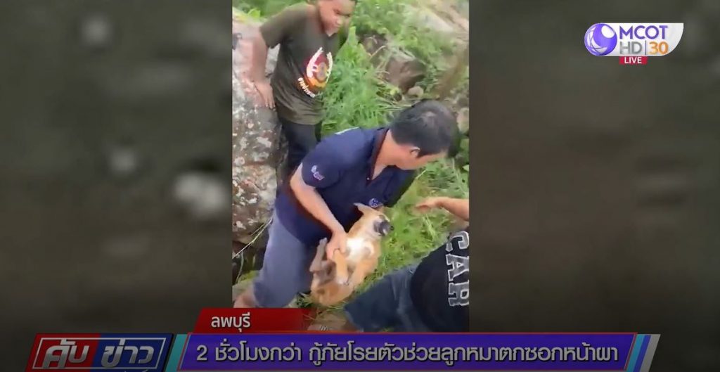ปรากฏเป็นสุนัขร้องมาจากภายในซอกหน้าผาลึก เจ้าหน้าที่กู้ภัยต้องใช้เชือกโรยตัวลงไปตามซอกหินที่ลึกกว่า 10 เมตร โดยมีเจ้าหน้าที่อีกชุดคอยรอรับสุนัขที่จุดรับลึกประมาณ 5 เมตร การช่วยเหลือเป็นไปอย่างยากลำบาก เนื่องจากแคบ เปียก มืด ที่สำคัญคือสุนัขตื่นกลัว วิ่งหนีใช้หัวซุกซอกหินในจุดที่ลึกที่สุด ซึ่งเจ้าหน้าที่ไม่ละความพยายามกว่า 2 ชั่วโมง มุดควานหาในมุมมืดตามเสียงสุนัขจนสามารถคว้าหางดึงตัวออกมาได้อย่างทุกลักทุเล