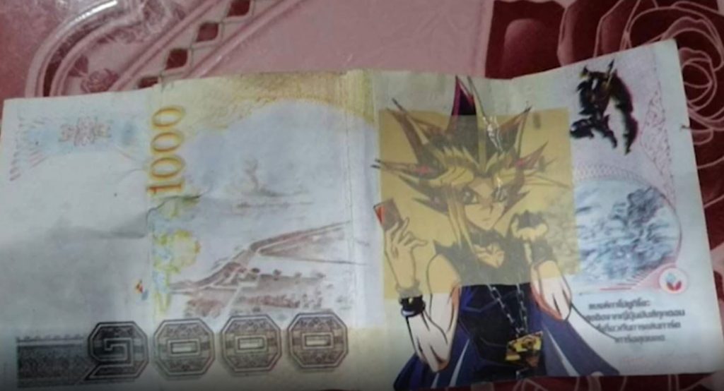 วงจรปิดจับภาพขณะชายขี่รถจักรยานยนต์ สีขาว ไม่ทราบแผ่นป้ายทะเบียน เข้ามาเติมน้ำมัน ที่ปั๊มเข็มทอง ปีโตรเลียมในอำเภอวังวิเศษ จังหวัดตรัง เป็นเงิน 60 บาท แล้วขอรับเงินทอน 940 บาท ก่อนยื่นจ่ายด้วยธนบัตรใบละ1,000 บาท ให้ลูกสาวเจ้าของปั๊มอายุ 14 ปี แล้วขี่รถหนีไป เมื่อลูกเจ้าของปั๊มคลี่แบงก์ออกพบว่าเป็นแบงก์กาโม่ ใช้ สก็อตเทปแปะติดบริเวณรูปการ์ตูน จึงรีบไปบอกแม่ แล้วโทรหาพี่ชาย