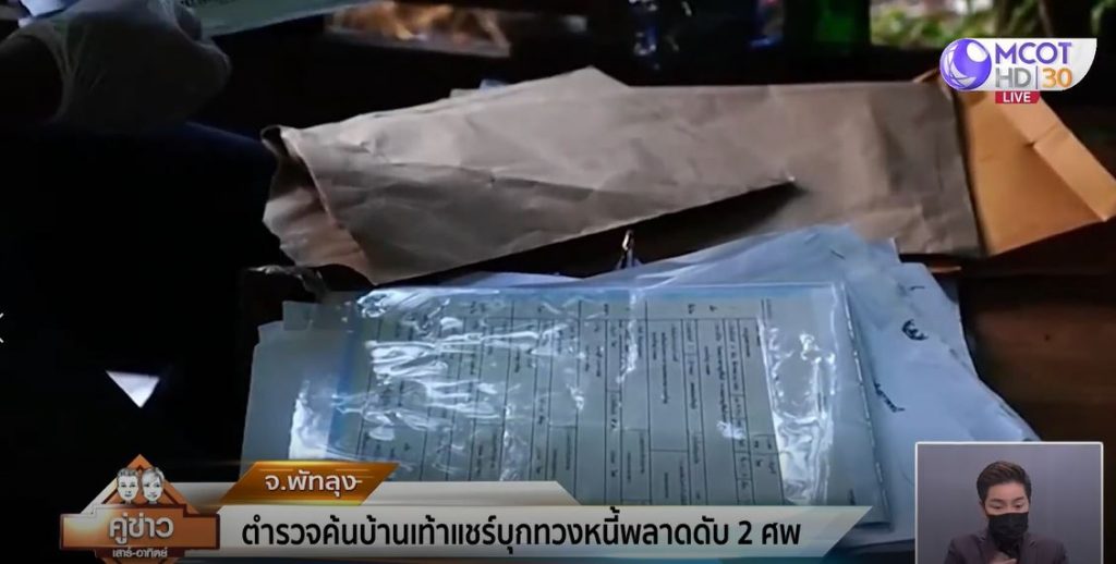 เจ้าหน้าที่ตำรวจชุดสืบสวนตำรวจภูธรจังหวัดพัทลุงและสืบสวนตำรวจภูธรภาค 9 นำกำลังตรวจค้นบ้านของผู้เสียชีวิตทั้ง 2 ราย และเท้าแชร์ นางสาวดิว อายุ 29 ปี รวม 3 จุด โดยเฉพาะจุดที่บ้านพักใน ต.หานโพธิ์ อ.เขาชัยสน จ.พัทลุง เจ้าหน้าที่พบหลักฐานเอกสารการปล่อยเงินกู้ และโฉนดที่ดินจำนองกู้เงินหลายฉบับ จึงตรวจยึดเพื่อตรวจสอบ พร้อมเปิดตู้เซฟขอตรวจค้นภายในตู้ แต่ไม่สามารถเปิดได้ ซึ่งต้องใช้รหัสเปิดอีกครั้ง ขณะที่แม่ของเท้าแชร์วัย 51 ปี และเป็นภรรยาของผู้เสียชีวิต ระบุว่าสามีและลูกสาวไม่ได้เป็นแก๊งทวงหนี้โหดแต่อย่างใด และสามีก็เลี้ยงวัว ทำแป้งสาคูส่งขายเท่านั้น